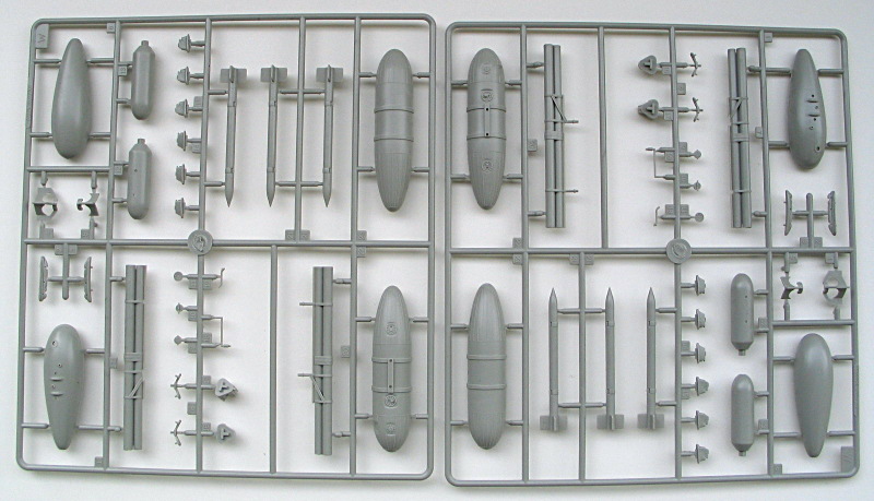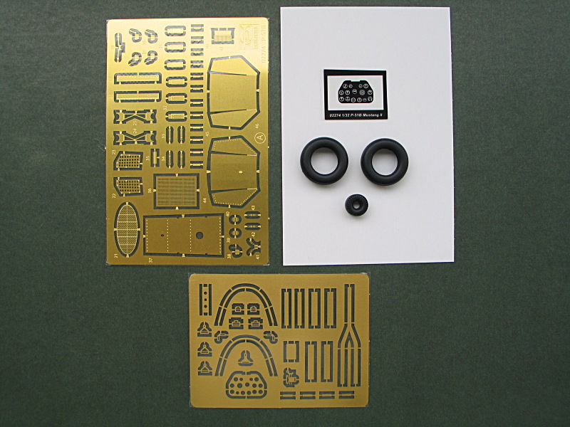 Vom Motor bis zum Cockpit, ist eine Vielzahl von Teilen zu verbauen. Für den Cockpitsitz liegen Fotogeätzte Gurte bei. Auch für das Instrumentenbrett liegt ein Metallteil bei. Das Cockpit ist gut Detailliert lässt aber noch Platz für Verbesserung. Das Fahrwerk ist gut wiedergegeben, sogar an die Bremsleitung wurde gedacht. Eine Menge Außenlasten liegen den Bausatz bei. Zwei Zeppelin ähnliche 108 Gallonen Tanks, und zwei 75 Gallonen Behälter, 4,5 Inch high Velocity Aircraft Raketenwerfer (HVAR) und zwei Abwurfbomben. Auch liegen den Bausatz 5 Inch Raketen bei. Diese wurden erst nach dem Zweiten Weltkrieg an die Mustang montiert. Ich habe auch kein Beleg dafür, das sie an der B Version geflogen sind.