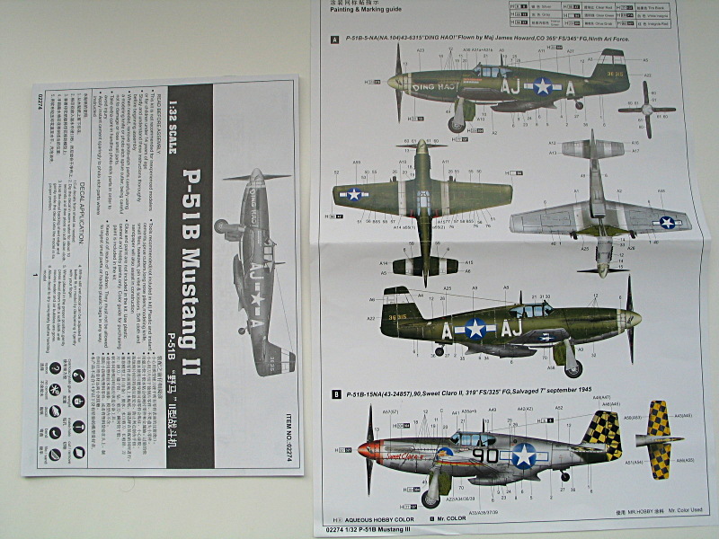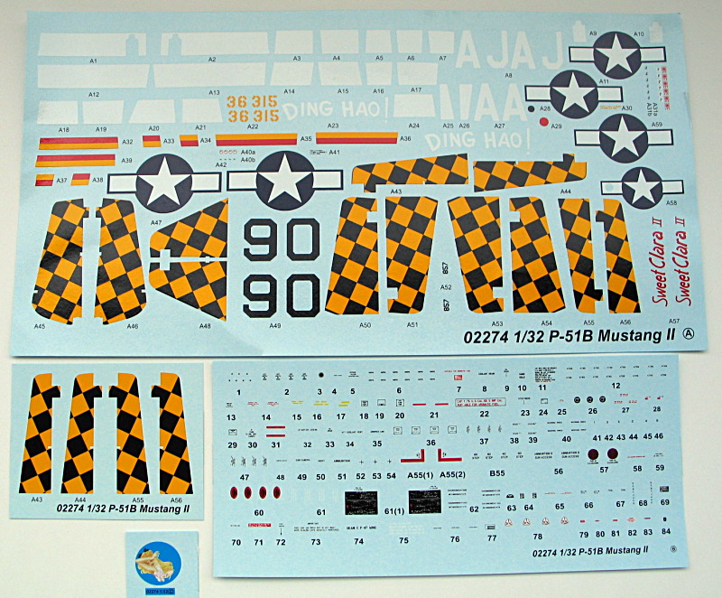 Bemalung: Der Decalbogen ist riesig. Und besteht aus drei Bögen und einen kleinen Nose Art Decal. Hier ist man eine weile beschäftigt. Die Decals sind sauber Gedruckt und hochglänzend. Es können zwei Maschinen aus den Decals gebaut werden. Eine P-51-B-5-NA (NA.105) 43-6315 "DING HAO!" Geflogen von Maj James Howard, CO 365 th FS/345 th FG, Ninth Ari Force u.P-51B-15NA (43-24857),90, Sweet Claro II, 319th FS/325th FG,Salvaged 7th september 1945.