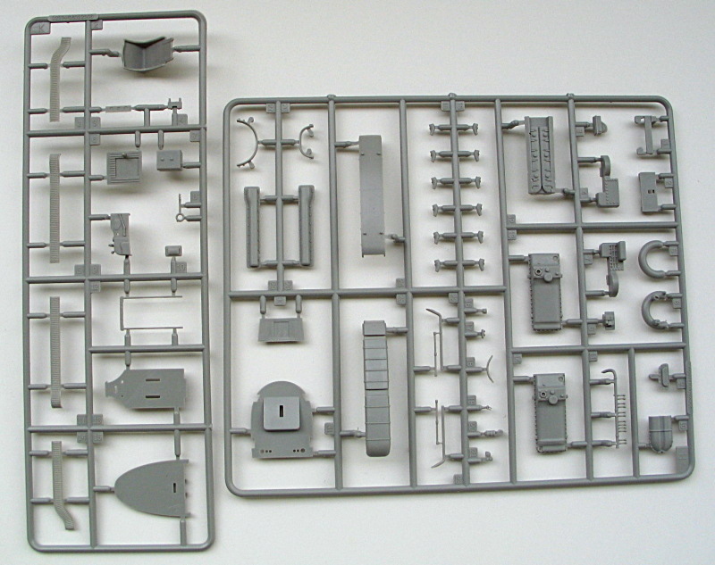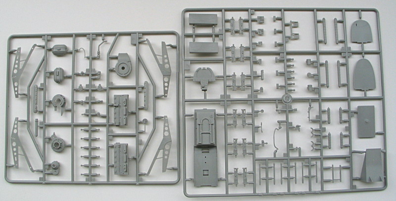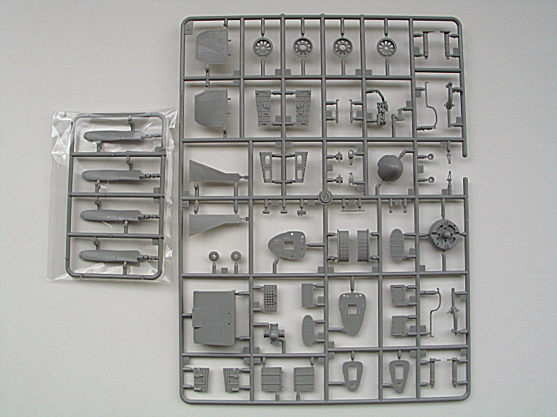 Eine Menge Ätzteileteile liegen dem Bausatz bei. Für den Cockpitbereich, für Klappen und Lüftungsgitter. Die Reifen sind aus Gummi und weisen ein schönes Profil auf. Um die Optik zu verbessern sollten sie leicht mit feinem Schleifpapier angeraut werden.