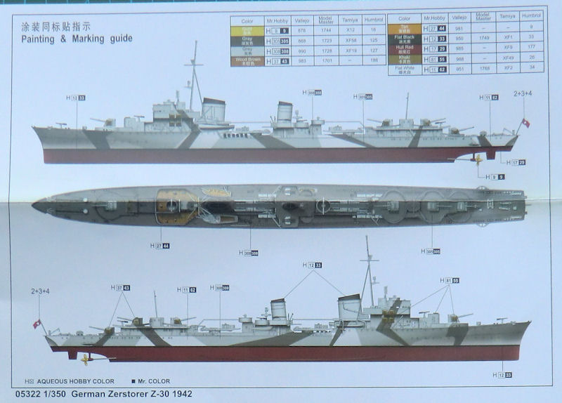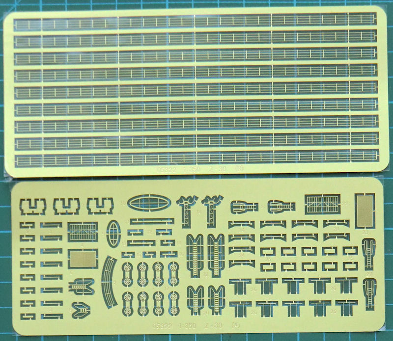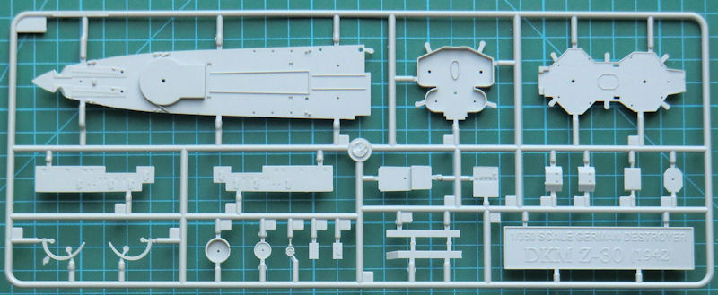 Bausatz: Der Z-30 ist der zweite Zerstörer 1936A von TRUMPETER im Maßstab 1/350. Hierbei handelt es sich um den ursprünglichen Bauzustand von ca. 1942. TRUMPETER liefert hier in einem praktischen Stülpkarton elf unterschiedliche große hellgraue Spritzlinge mit 377 Teilen, zwei Fotoätzteilbögen, ein kleiner Decalsatz, der mehrfarbige Bemalungsplan und die übersichtliche Bauanleitung.