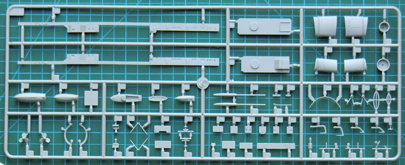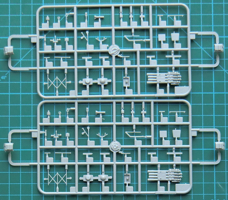 Auch bei diesem Bausatz sind natürlich die Schiffsschrauben und die Kleinteile gut getroffen. Die Schornsteine erhalten Abdeckungen aus Fotoätzteilen. Letztere werden auch für die Antennen benötigt. Natürlich gibt es hier als notwendiges Zubehör auch einen beschrifteten Ständer.