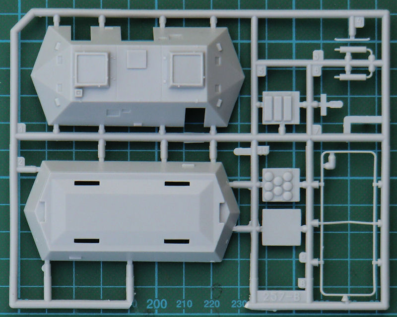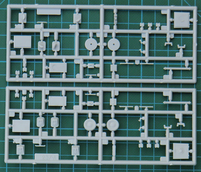 Bausatz Im unpraktischen aber attraktiven Schüttkarton von UM befinden sich gut verpackt vier hellgraue Spritzlinge mit insgesamt 51 Bauteilen, die übersichtliche Bauanleitung und ein kleiner Decalbogen.
