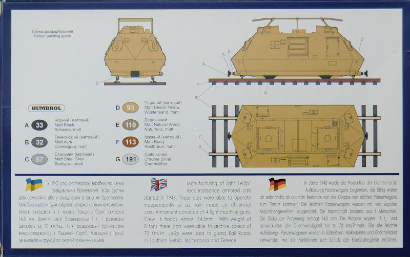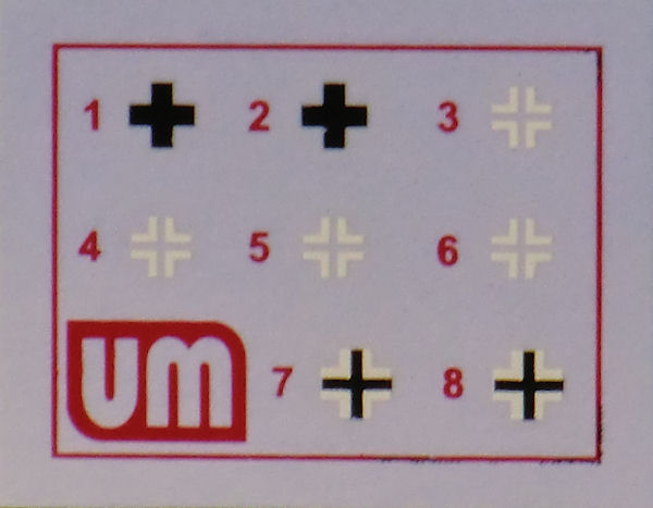 Ein kleines Stück Gleismaterial wird mitgeliefert. Die oberen Schienenteile müssen einzeln aufgeklebt werden. Eine ungewöhnliche Konstruktion. Wem die Rahmenantenne nicht filigran genug ist, der muss diese aus Draht herstellen. Fertiggestellt kann der leichte Schienenpanzer in einer frühen und späten Version. Ein kleiner Decalbogen enthält ein paar Balkenkreuze.