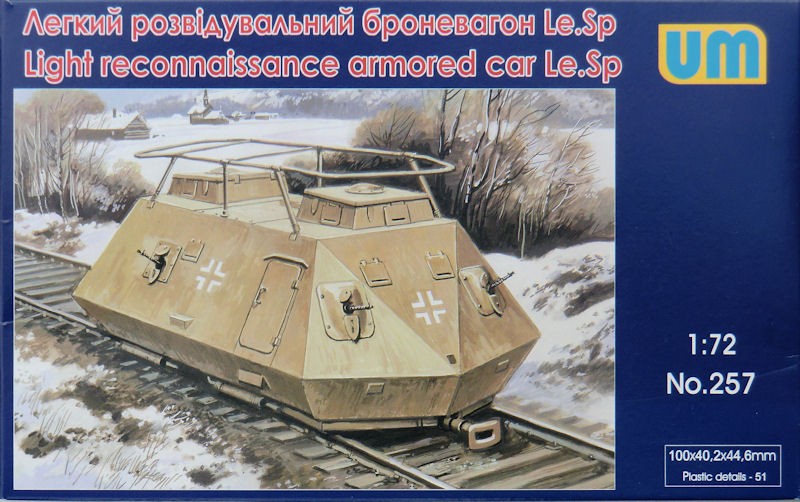 Einen Bausatz dieses leichten Schienenpanzers gab es bisher nur aus Resin von diversen Herstellern. Nun hat UM einen Spritzgussbausatz im Short-Run-Herstellungsverfahren herausgebracht. Die Abspritzung und Detaillierung der Bauteile ist gut. Leider ist das Fahrzeug nicht von innen detailliert und kann damit nicht offen präsentiert werden. Diverse Luken werden einzeln eingeklebt und hierbei gibt es Optionen.