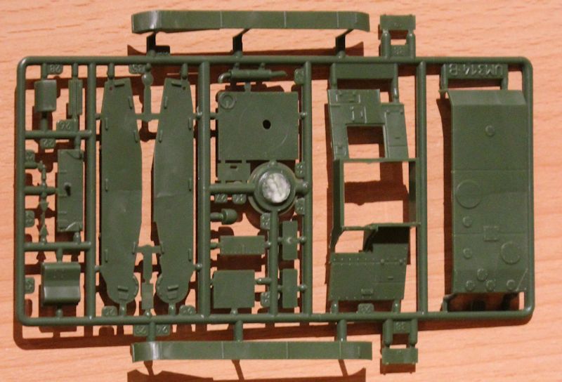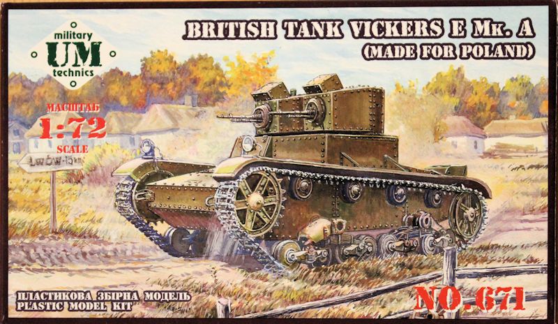 Bausatz: Die Firma UM hat den kleinen Panzer Vickers E Mk.A in der Produktion für Polen herausgebracht. In dem schön gestalteten Faltkarton befinden sich die Bauanleitung, drei grüne Gießäste, zwei kleine Platinen mit Ätzteilen und Gummiketten. Abziehbilder liegen keine dabei. Die Bauanleitung ist in der typischen UM-Qualität für diesen Bausatz etwas unübersichtlich und führt in 14 Schritten zum fertigen Modell.
