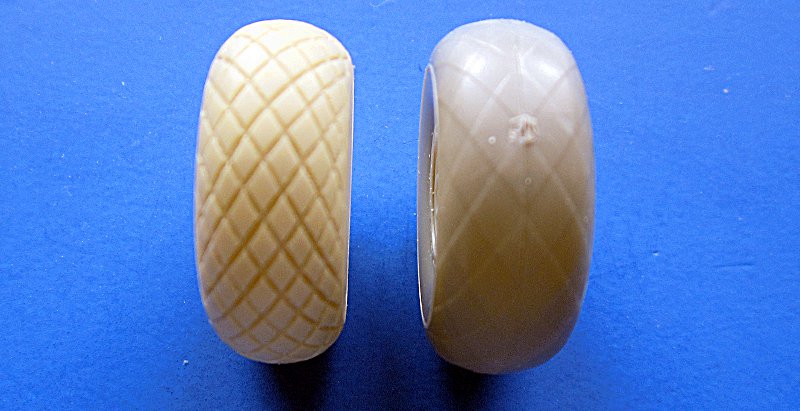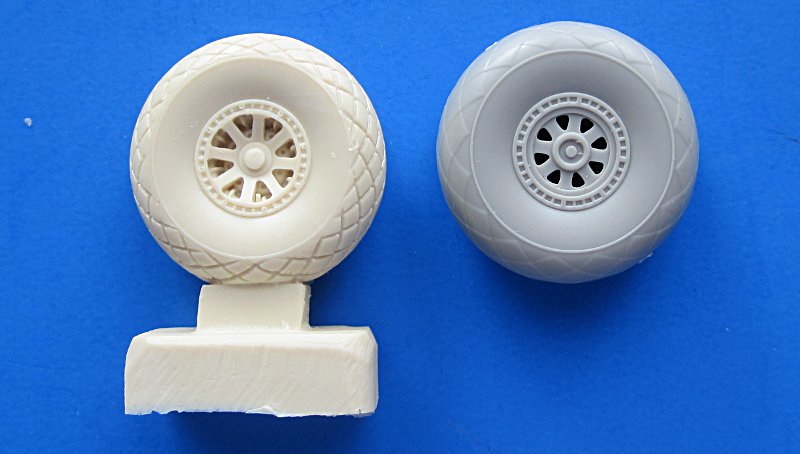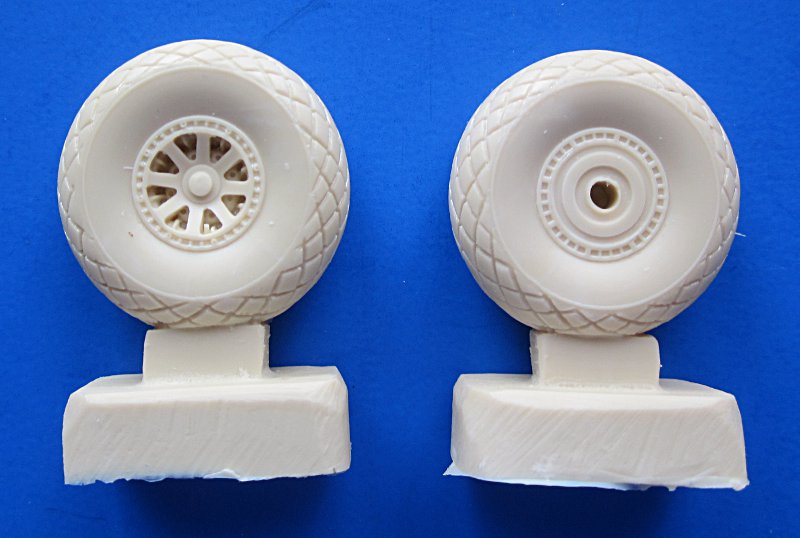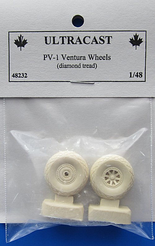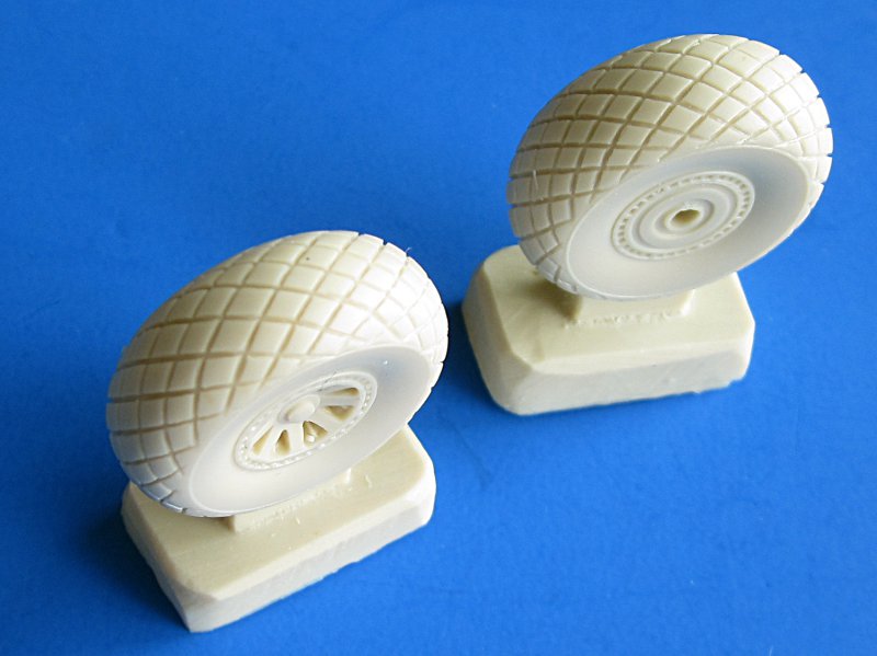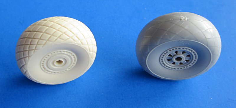 Der zweifellos sehr gute Revellbausatz der Lockheed PV-1 Ventura wird nun von den Kanadiern mit zwei Rädersätzen bedacht. Die Bausatz-teile sind nicht mal schlecht, aber die Einschränkingen der Spritzgussform lassen komplexere Reifenstrukturen nicht so einfach zu. Hier ist Resin die bessere Alternative um das Rautenmuster darzustellen.