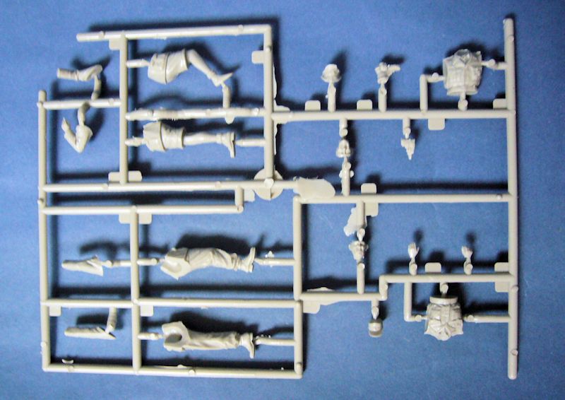 Ein hellgrauer Spritzling für zwei Soldaten bei. Die beiden Figuren sind sehr schön gestaltet und ermöglichen den Bau einer kleinen Vignette, da eine der Figuren offensichtlich einen Stein im Schuh hatte und sich auf den Kameraden gestützt versucht, das Übel los zu werden.