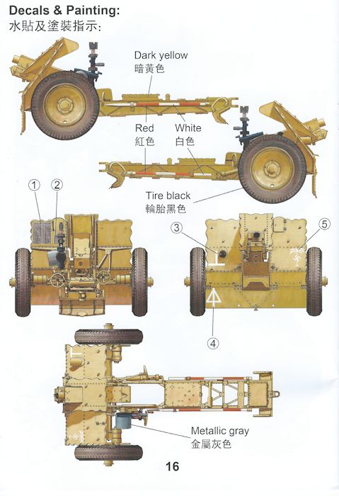 Bemalung: Zur Bemalung bieten sich die beiden Varianten Dunkelgelb oder Panzergrau an, für die Mannschaft ist man wegen der Uniform in erster Linie an Dunkelgelb bzw. Afrika Bemalung gebunden. Referenznummern für die Farben findet man leider keine. Als Bauanleitung liegt ein 20 seitiges Heft im Format DIN A5 bei, in dem in insgesamt 16 Bauabschnitten alle Montageschritte in sehr übersichtlicher Form und farbig gestaltet sind.