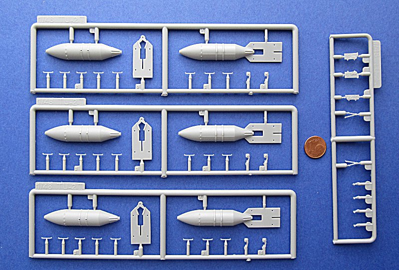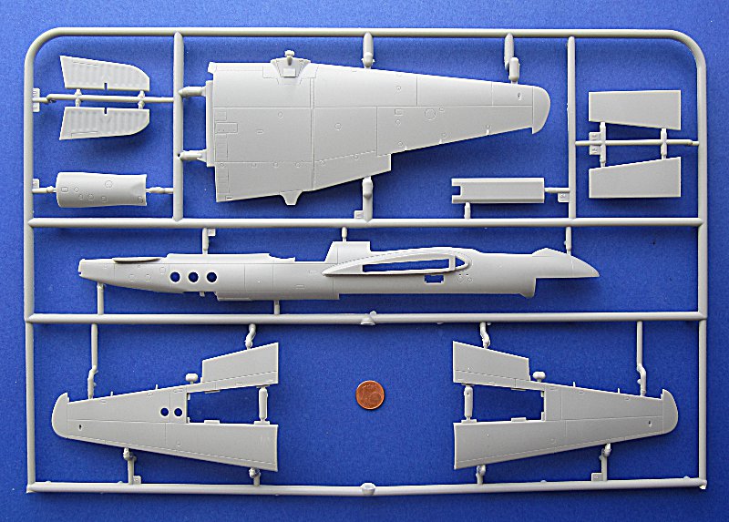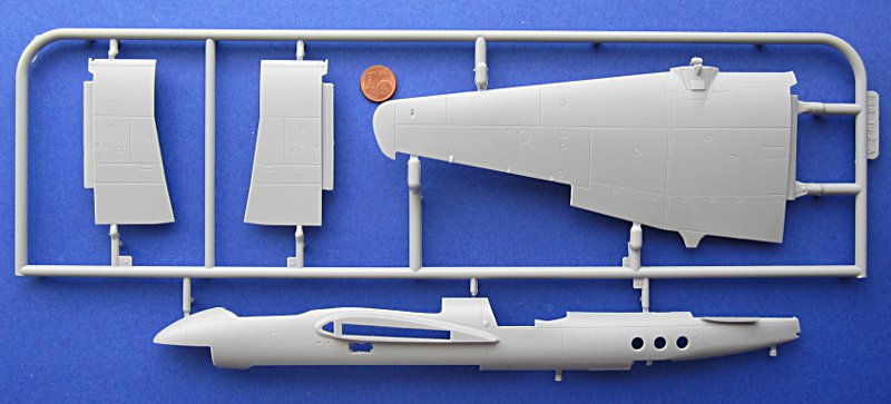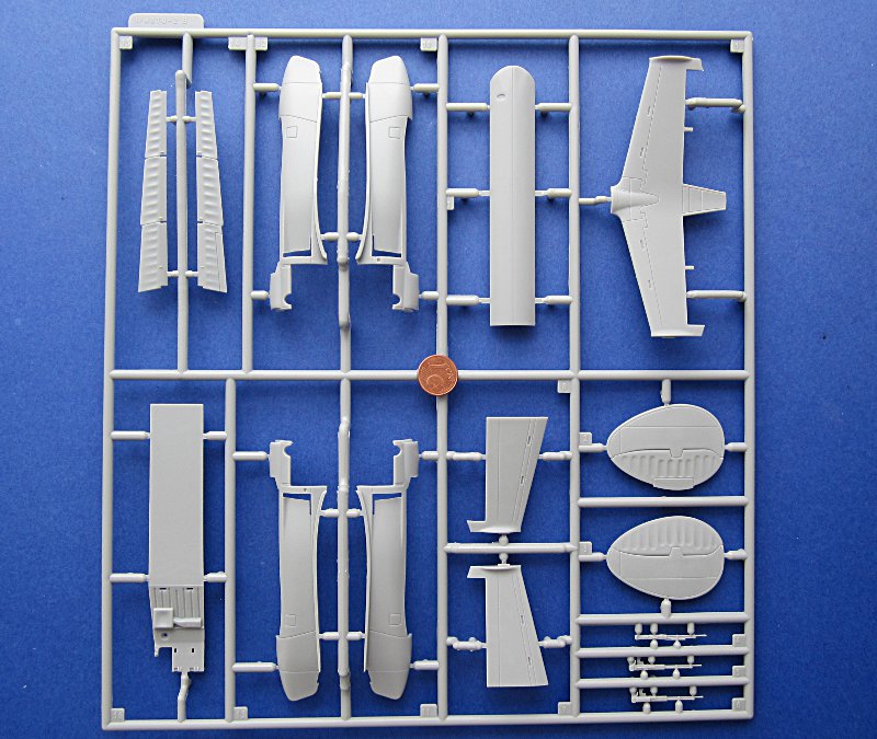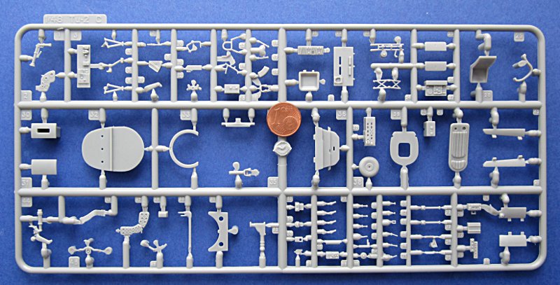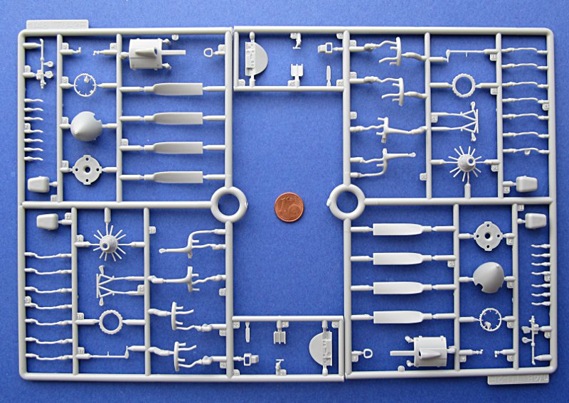 Der große stabile Stülpkarton ist gut gefüllt. Die Gießrahmen haben eine beträchtliche Größe und Stärke und auch die Teile sind eher stabil. Die Gravuren sind versenkt und ordentlich dargestellt. Auch hier wird allerdings nicht die Finesse anderer Hersteller erreicht. Die Angüsse liegen auf der Klebefläche der Teile, was mir persönlich gut gefällt. Größtes Problem des Produktionsprozesses sind die Auswerfermarken im Rumpf. Diese dürften schwer zu entfernen sein, da sie zwischen aufgeprägten Details liegen.