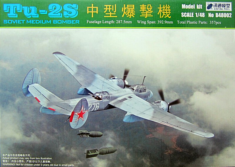 Bausatz: Mitte vergangenen Jahres brachte die bis dato - zumindest mir - unbekannte Firma Xuntong ihren ersten Plastikspritzgussbausatz heraus: die Tupolew Tu-2. Wie das heutzutage üblich ist kam zuerst eine für die meisten Modellbauer eher uninteressante Nachkriegsversion mit Torpedos heraus (Tu-2T). Aber schon kurz darauf folgten Einsatzvarianten aus dem Großen Vaterländischen Krieg, darunter die hier vorgestellte Tu-2S.