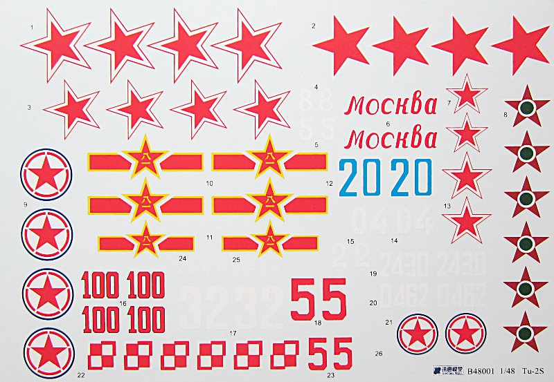 Die Bauanleitung ist ganz ordentlich gemacht und sollte sicher zum Ziel führen. Leider wird nicht immer daraufhin gewiesen, welche der Optionen für welche Bemalungsvariante zu verwenden ist. Die Anleitung für die Markierungsoptionen ist nahezu unbrauchbar. Die farbigen Seitenrisse vom Karton sind einfach noch mal in schwarz-weiß abgedruckt und es gibt keine 4-Seiten-Ansicht. Die Farbangaben sind in englisch, russisch, chinesisch angegeben und den Farbnummern von ModelMaster, Gunze und Tamiya zugeordnet. Leider gibt es nicht für jede Farbe von jedem Hersteller eine Zuordnung. Wie immer folgt hier der Hinweis auf die Farbtabellen der IPMS Stockholm (Urban Fredriksson's Color charts). Weiterhin sei die Seite von Massimo Tessitori empfohlen: http://mig3.sovietwarplanes.com/tu-2/tu-2.htm