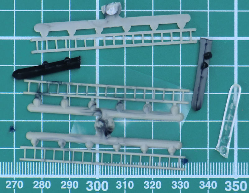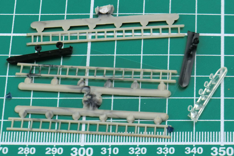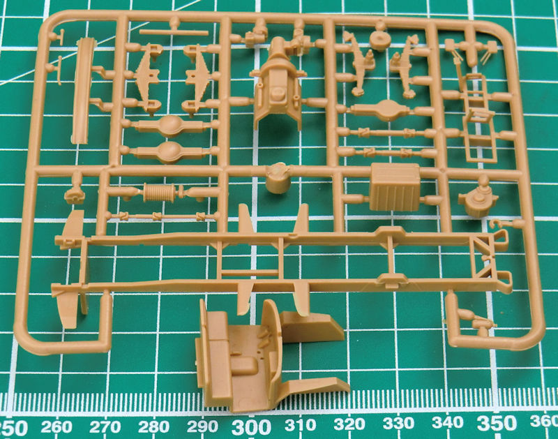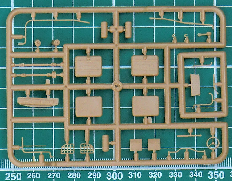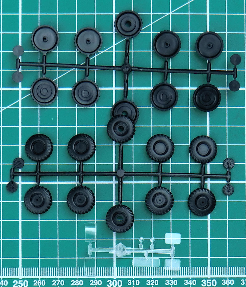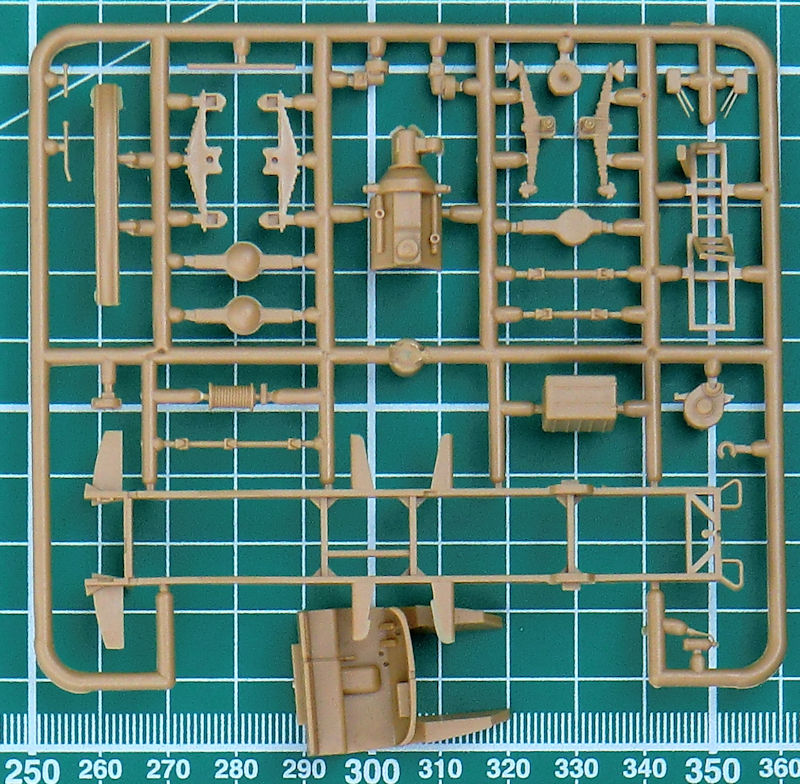 Die Spritzgussteile stammen von dem ICM-Bausatz des ZIL-131 und sind sehr sauber gespritzt. Die grauen Leitern sehen sehr nach einer Short-Run-Form aus und benötigen etwas Nacharbeit. Der Bau beginnt mit dem gut detaillierten Fahrwerk. Die Räder entstehen aus drei Teilen.