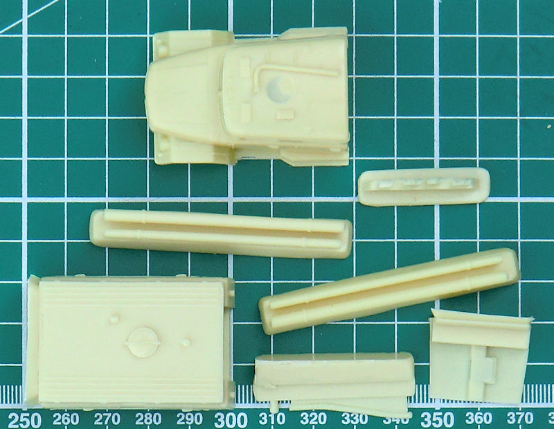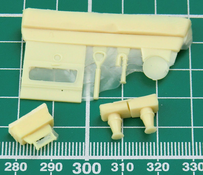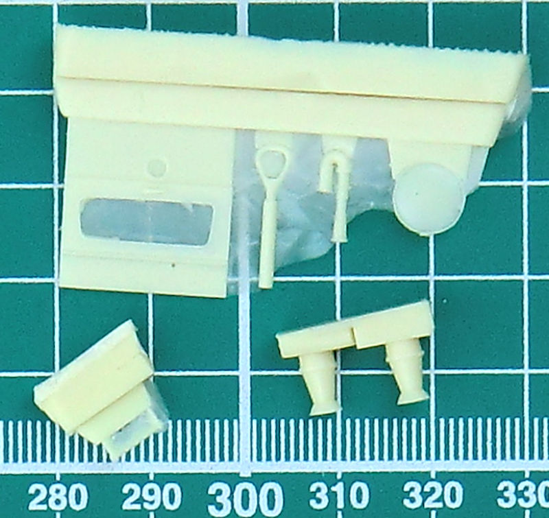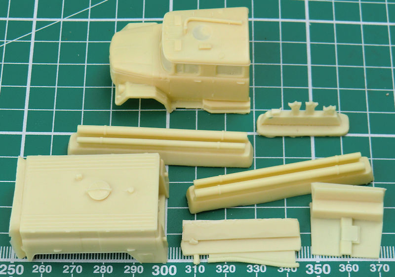 Das große Fahrerhaus besteht aus Resin. Auch der große Spezialaufbau ist aus diesem Material. Alle Türen und Klappen bleiben zu. ICM verdanken wir auch einen V-8-Motor und einen Kühler. Interessant sind die feinen Schutzgitter für die Scheinwerfer.