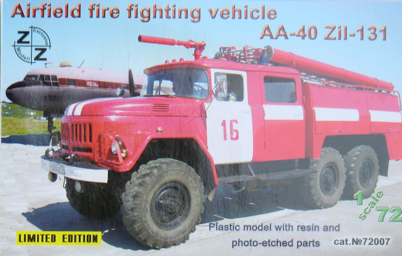Bausatz: ZZmodel hat neben einigen Fahrzeugmodellbausätzen in 1/87 auch diverse in 1/72 im Angebot. Es handelt sich zumeist um sowjetische Vorbilder. So gibt es auch das Feuerwehrspezialfahrzeug AA-40 auf ZIL-131 als Spritzgussbausatz mit Fotoätz- und Resinteilen. Im praktischen etwas labilen Stülpkarton befinden sich gut verpackt zwei ockerfarbene Spritzlinge mit 56 (incl. Kabineneinrichtung) Teilen, 30 schwarze Spritzgusteile (u.a. Räder), zwölf klare Spritzgussteile, drei graue Leitern aus Spritzgussmaterial, ein Fotoätzteilbogen, 19 Resinteile und die Bauanleitung.