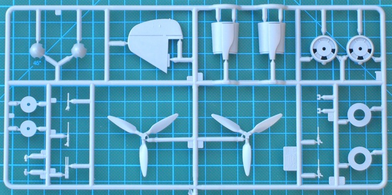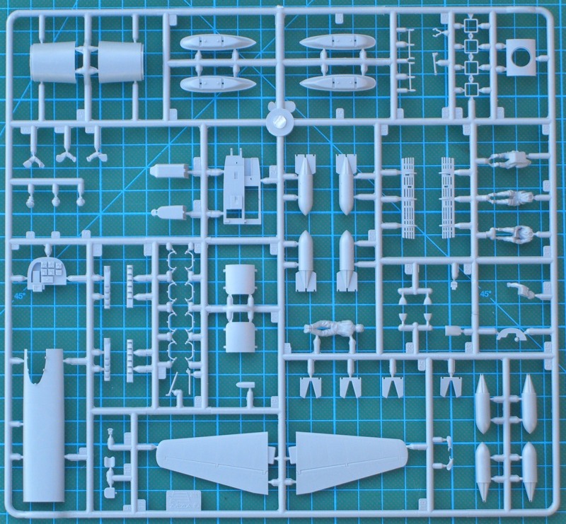 Einige Bauteile sind von der G-Version bekannt. Übernommen wurde nur ein Rahmen mit Teilen. Die Detaillierung war schon damals auf hohem Niveau. Nun hat Zvezda ein paar neue Teile hinzugefügt, die dem Stand des heutigen Formenbaus entsprechen. Als Neuteile gibt es die anderen richtigen Bauteile für die Motoren, eine neue Cockpiteinrichtung, neue Abwehr- und Abwurfwaffen, Sturzflugbremsen und die dünnen sehr durchsichtigen neuen Klarsichtteile.