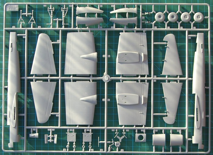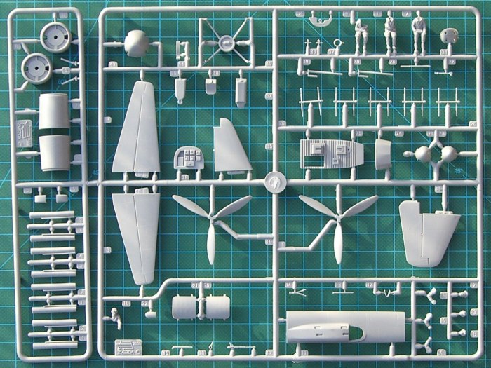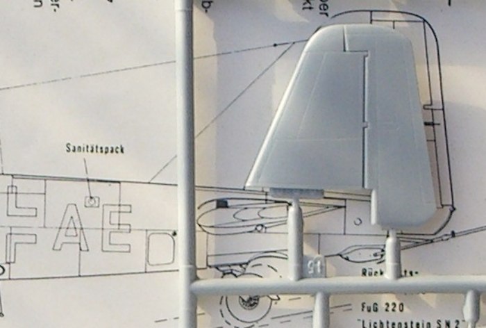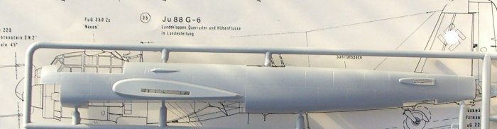 Der große Karton enthält zwei hellgraue Spritzlinge und die Klarsichtteile, die extra verpackt sind. Die Gravuren der Bauteile sind überraschend fein und der Aufbau des Bausatzes ist modular. Da diese Ju 88 zeitgleich mit der von Hasegawa entstand, muss sie sich auch einen Vergleich gefallen lassen. Was fällt auf? Hier liegen Licht und Schatten dicht beieinander. Die Zeichnungen von Michael Merker (Flugzeug Nr. 1 1986) wurden auch genutzt. Der Rumpf ist recht stimmig. Entgegen einiger anderer Meinung auf den letzten Klubabend stimmen die Bauteile für den Jumo 213 mit dem Original überein. Auch hatte ich die bei RAI-RO (nach Dr. Busse) erhältlichen Triebwerke als Vergleich verwandt, obwohl minimale Unterschiede sichtbar werden. Leider sind die Motorgondeln im hinteren Bereich etwas schlank. Allerdings nicht so stark, wie bei Italeri/AMTech. Ein großes Problem stellt das zu keine Seitenruder dar. Das fiel mir sofort ins Auge. Der Vergleich mit der Zeichnung zeigt die Dimensionen. Bodenwanne, Flammendämpfer, Luftschrauben und andere Bauteile gehen in Ordnung. Das Teil B24, welches das Zwischenstück zwischen Rumpf und Bugspitze darstellt, ist total eckig und daneben. Das abzuändern betrachte ich auch nicht als Problem. Interessant auch die Lösung für die Antennen im Bugbereich. So kann beim Auswinkeln nichts schief gehen.