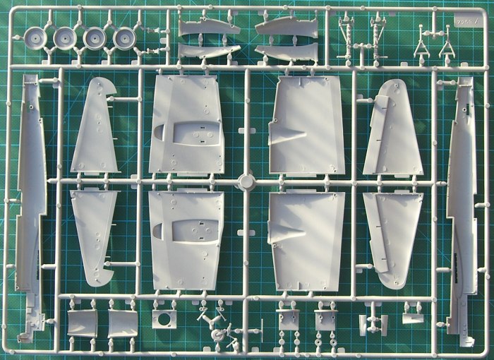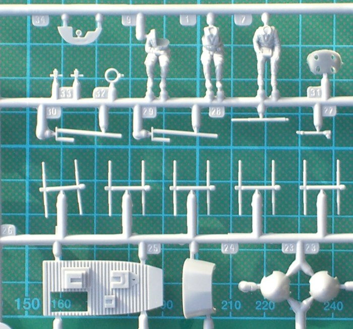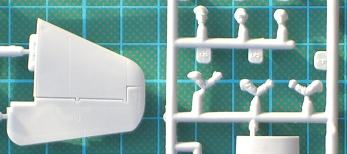 Die Kabine ist auch mit Schatten belegt. Sitze, Steuerknüppel und ein paar Instrumente sind vorhanden. Für das eigentliche Instrumentenbrett gibt es ein Decal. Ungewöhnlich für eine Neuheit ist die Ausstattung mit Besatzungsfiguren. Bei denen gibt es nichts zu meckern. Für den Piloten gibt es sogar einen alternativen Kopf. Bemalungshinweise für die Figuren fehlen leider total. Die Decals sind hochglänzend gedruckt und die links auf dem Bogen vorhandenen Winkel gehören auf das Seitenleitwerk.
