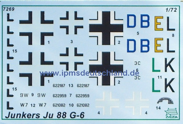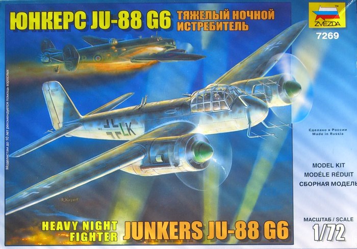 Bausatz: Auf der Spielwarenmesse 2006 war die Junkers Ju 88G-6 als Neuheit bei Zvesda angekündigt, was für erhebliche Überraschung sorgte. Entgegen mancher Befürchtungen handelt es sich nicht um eine Übernahme einer bisher vorhandenen Form, sondern um eine Eigenentwicklung.