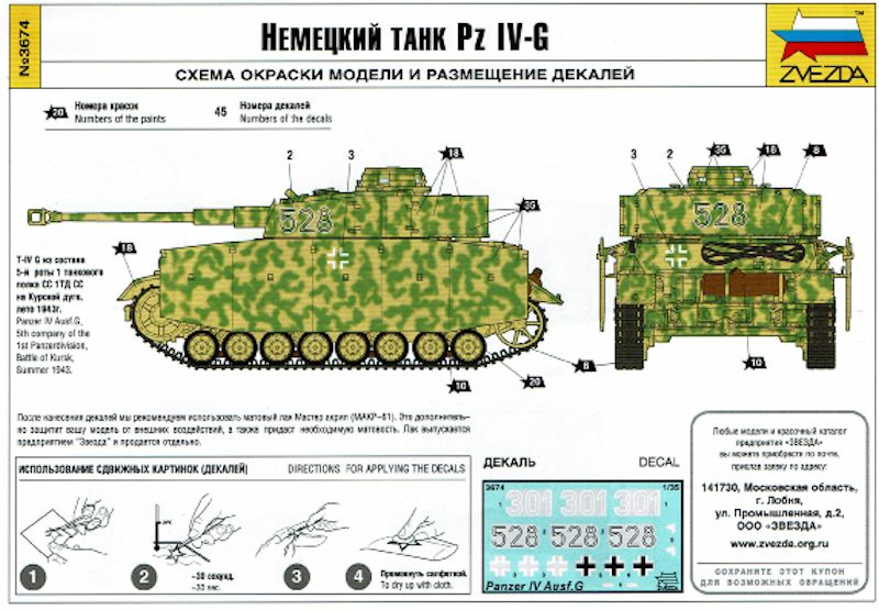 Bauanleitung/ Bemalung: Die Bauanleitung ist klar und übersichtlich aufgebaut und führt verständlich durch 28 Bauabschnitte. Ein zusätzlicher Colourguide hilft bei der Auswahl der zu bauenden Variante und bei den Farben. Zvezda bezieht sich bei den Farben auf die Produkte des eigenen Hauses und auf Tamiya. Der Abziehbilderbogen, sauber und versatzfrei gedruckt, lässt den Bau von zwei Fahrzeugen zu: