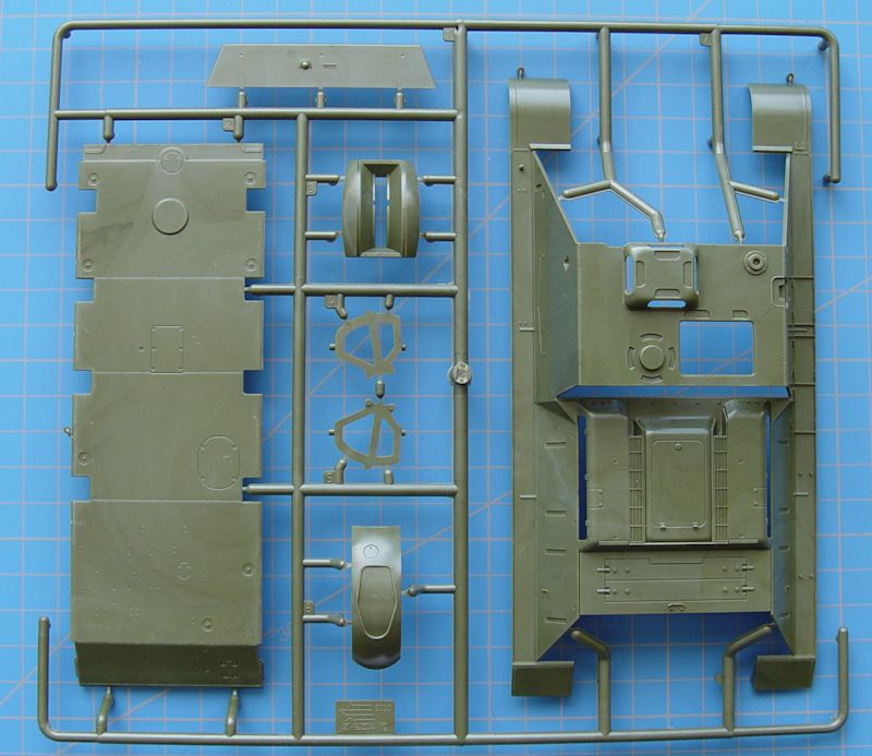 Im bekannten stabilen Faltkarton finden wir einen A4-Spritzrahmen, zwei in A5 und fünf für die Räder 5 im A7 Format. Der verwendete grüne Kunststoff ist ein wenig zu weicht. Das merkt man beim Entgraten, der Kunststoff schmiert dann, und man hat immer wieder Grat. Zu weicher Kunststoff ist auch zu sehen beim "Biegen" oder Richten der Bauteile, sofort sind weiße Stellen zu sehen. An sich sind die Rahmen sind sauber gegossen.