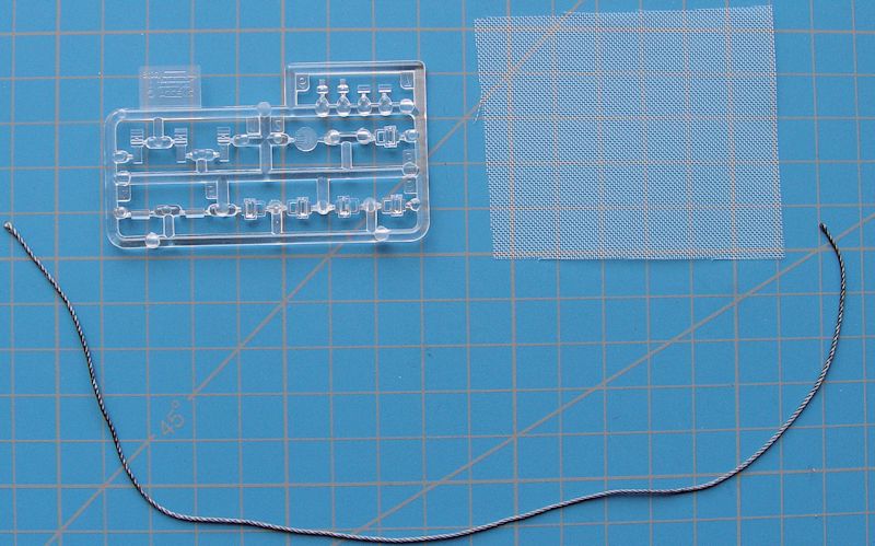 Es liegt dem Bausatz ein Gazekunststoffstück für die Lüftungsgitter des Motors bei, ich habe es einfach mal ausprobiert, und bin überrascht wie gut es aussieht. Auch beim Original war das Gitter recht grob, krumm und schief. Das gleiche gilt auch für das Schleppseil. Deshalb habe ich auch die im Bausatz beigelegte Schnur verwendet.