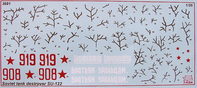 Bauanleitung/Bemalung: Eine einfache Bauanleitung führt auf sechs Seiten in 20 Bauabschnitten durch den Bau. Der Dekovorschlag findet sich auf einer farbigen extra Anleitung. Farbangaben in Tamiya und Zvezda. Auf dem Decalbogen ist ein Winter-Tarnmuster. Eine gute Idee. Leider wird man den Trägerfilm sehen. Ich empfehle es gleich selbst mit dem Pinsel aufzumalen. Da muss man dann auch nicht so genau arbeiten.