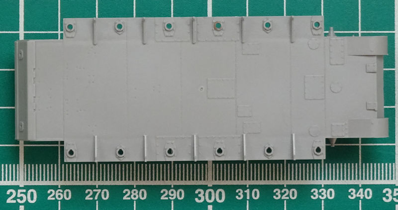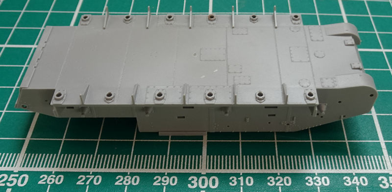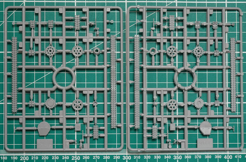 Im Gegensatz zum TRUMPETER-Kit hat Zvezda das komplexe Fahrwerk des T-28 sehr detailliert wiedergegeben. Jede Lauf- und Stützrolle ist einzeln vorhanden. So beginnt der Bau natürlich mit dem Laufwerk und der Unterwanne. Die sehr detaillierte Kette wird aus mehreren Segmenten zusammengesetzt.