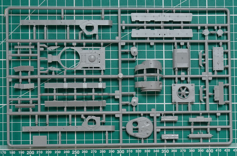 Zvezda hat die beiden kleinen Türme in vier größere Teile zerlegt. Die Luken bleiben allerdings zu. Leider hat man die Abdeckung des großen Lüfters im Heck nicht durchbrochen. Dadurch ist von den Details wenig nach der Montage zu sehen. Hier kann man die Abdeckung nur von innen dünner schleifen. Ein Fotoätzteil könnte diese Arbeit überflüssig machen. Der große Turm wird ebenfalls aus mehreren Teilen zusammengefügt. Dafür kann man aber die Kommandantenkuppel einzeln ankleben. Alternativ kann dort auch noch ein MG befestigt werden. Die filigrane Antenne sollte man zum Schluss montieren.