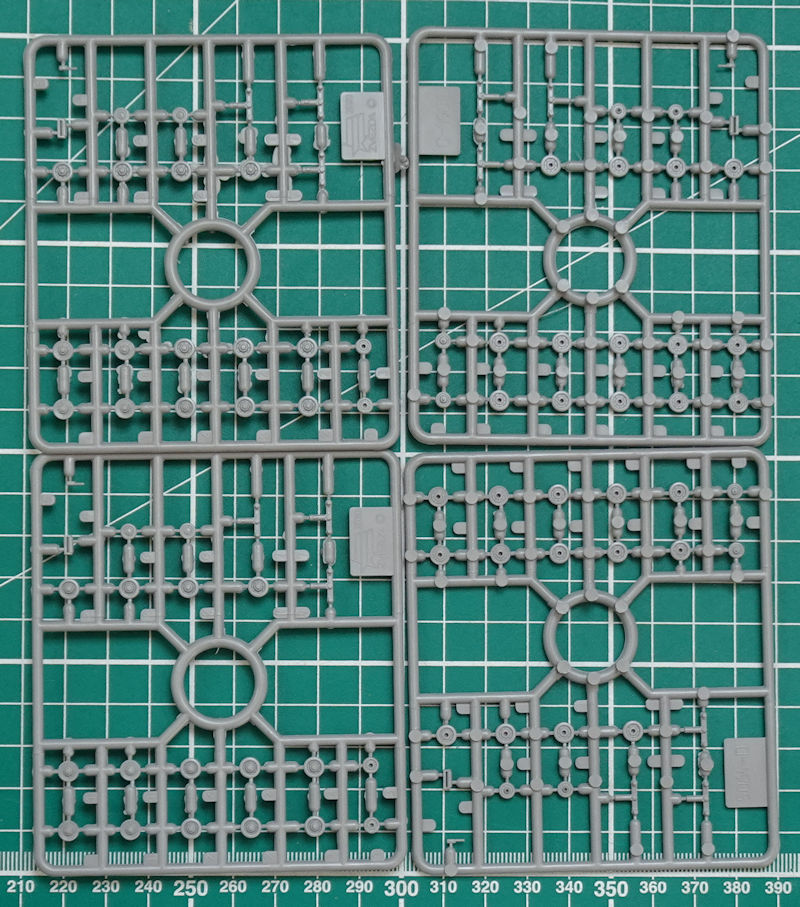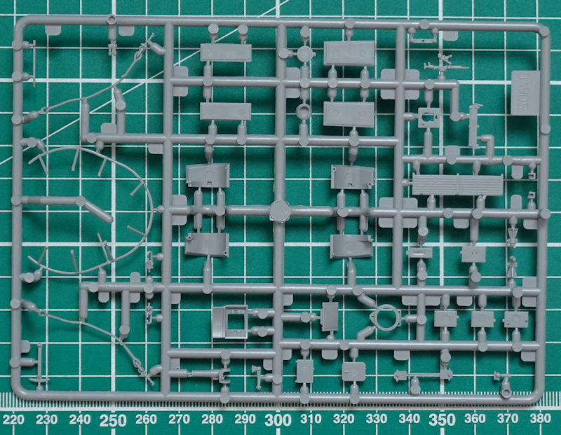 Allein sechs Spritzgussrahmen enthalten Teile für das komplexe Fahrwerk. Nur die Unterwanne besteht aus einem recht komplexem Spritzgussteil. Mich begeistern u.a. die einteilige filigrane Antenne und die in Form gebrachten Abschleppseile.