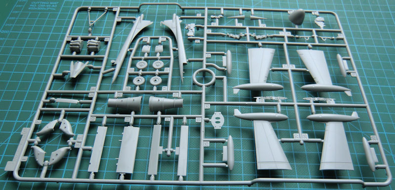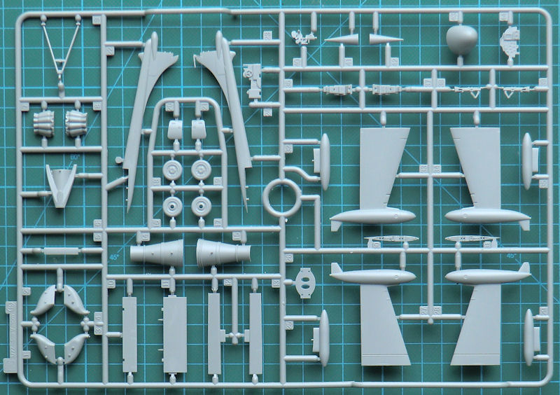Der Bau des Bausatzes beginnt recht ungewöhnlich mit dem Fahrwerk. Weiterhin gibt es ein komplettes Triebwerk samt Lufteinlauf welches aus zehn Bauteilen besteht. Das Cockpit ist zeitgemäß detailliert. cyber-hobby liefert separate Seiten-, Quer- und Höhenruder. Daher gibt es hier scharfe Hinterkanten.
