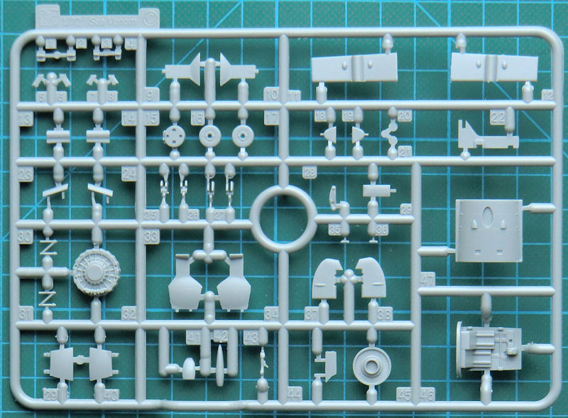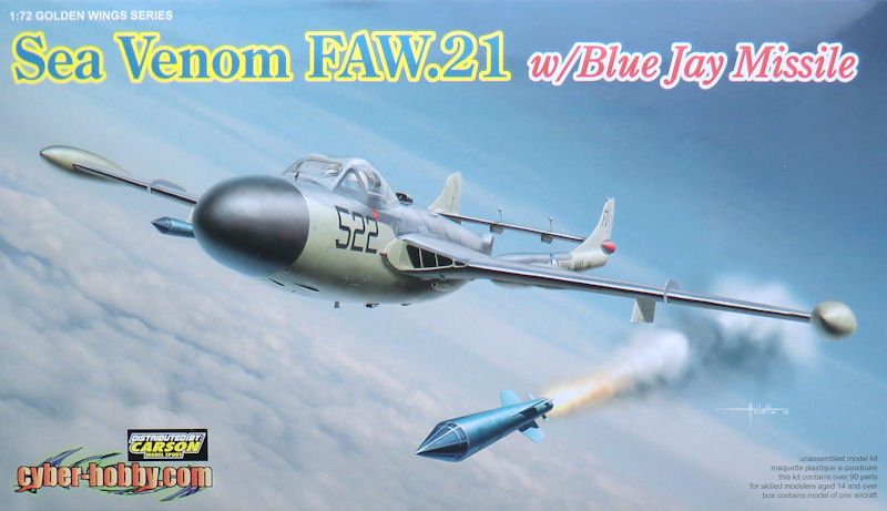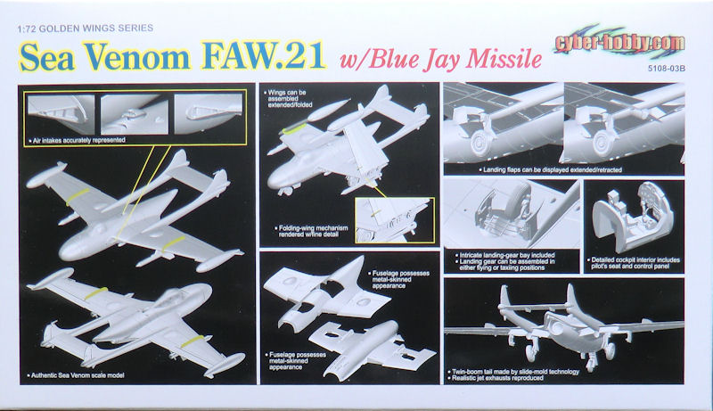 Bausatz: cyber-hobby hat mitunter eine recht ungewöhnliche Modellauswahl. Neben der Sea Vixen und der Vampire gibt es nun inzwischen zwei Bausätze der Sea Venom FAW. 21. Beim Öffnen des attraktiven Stülpkartons staunt man zunächst über die Vielzahl der Bauteile. So gibt es vier hellgraue Spritzlinge mit 95 Bauteilen, ein Klarsichtrahmen mit drei Teilen, ein kleiner Fotoätzteilbogen, die Decals sowie die typische Dragon/cyber-hobby-Bauanleitung.