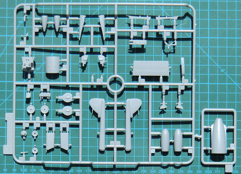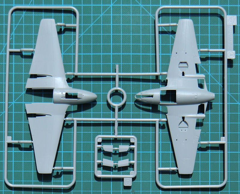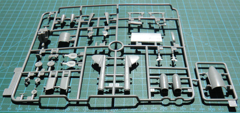 Bausatz: Der gut gestaltete sowie praktische Stülpkarton von cyber-hobby/Dragon enthält gut verpackt zwei graue Spritzlinge mit 43 Teilen, zwei Klarsichtteile, die typische cyber-hobby/Dragon-Bauanleitung und einen Decalbogen. Die Teile sind typisch für den Hersteller. Es gibt feine versenkte Strukturen. Es gibt auch ein paar Sachen, die mich nicht gerade begeistern. So ist das Bugrad deutlich zu breit und wirkt wie eine Felge ohne Reifen. Hier hilft die Restekiste sicherlich weiter. Schwieriger sieht es bei den Leitwerksträgern aus. Diese sind etwas unterdimensioniert. Aber nicht so sehr, wie es im Vergleich mit den CMR-Kits scheint. Damit kann wohl jeder leben.