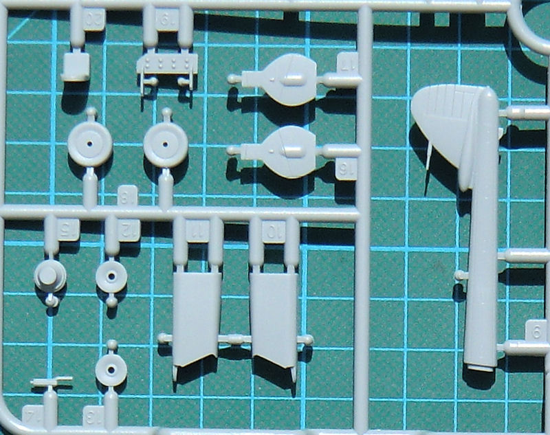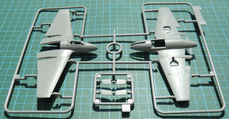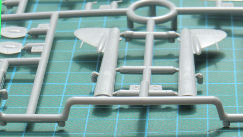 Das Cockpit entsteht aus drei Teilen. So gibt es eine schön strukturierte Wanne mit Instrumentenbrett und weiteren Details. Allerdings vermisse ich ein ordentliches Decal für die Instrumente. 2,5 Gramm sollen als Gegengewicht im Bug reichen. Die Konstruktion mit Ober- und Unterschale samt Fläche ist gut gemacht. Es gibt ein zwei tiefere Lufteinläufe. Das Höhenleitwerk besteht aus einem Stück. Bei den beiden Leitwerksträgern ist es auch jeweils so. Diese müssen auf der Tragfläche ausgerichtet werden.
