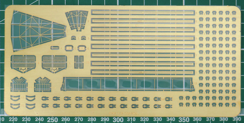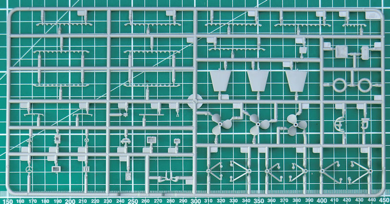 In dem sehr großen stabilen Stülpkarton befinden sich gut verpackt 21 graue Spritzgussrahmen bzw. Großbauteile, ein klaren Spritzling mit 16 Teilen, zwei Fotoätzteile, drei Wellen für die Schiffsschrauben, bisschen Draht, eine Kette, ein Decalbogen, eine mehrfarbige Bemalungsanleitung und die übersichtliche Bauanleitung.
