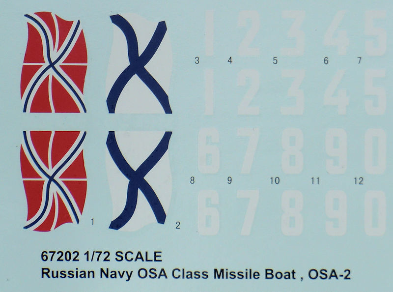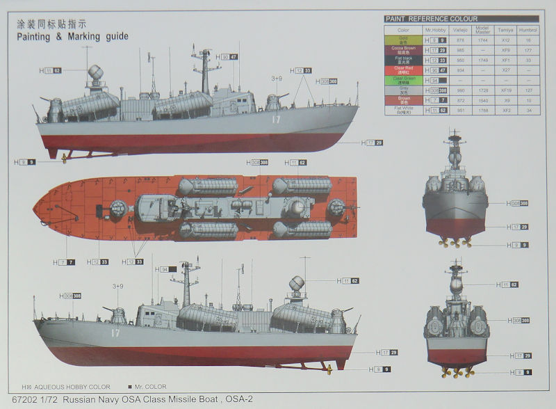 Der mehrfarbige Bemalungsplan auch beim OSA-2-Boot etwas zu klein geraten. Details gehen dadurch verloren. Immerhin sind die Farbhinweise in Chinesisch und Englisch. Weiterhin gibt es einen Verweis auf die Farbsysteme von Mr. Hobby, Vallejo, ModelMaster, Tamiya und Humbrol. Zum russischen Vorbild gibt es leider keine weitergehenden Informationen. Auch hätte ich mir vielleicht noch paar andere Flaggen gewünscht, denn das Original wurde ja exportiert und auch im Kampf eingesetzt.