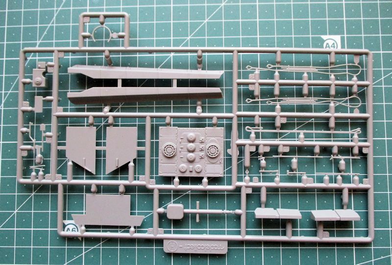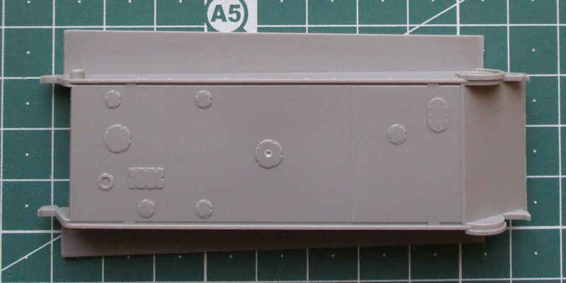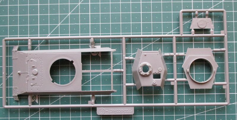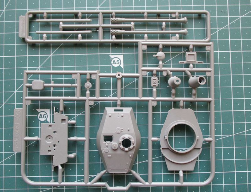 Alle Teile sind sauber und gratfrei wiedergegeben. Es gibt ein paar Sinkstellen, die etwas ungünstig liegen und vor dem Zusammenbau verspachtelt werden müssen. Die Oberfläche der Panzerplatten weist eine leicht aufgeraute Struktur auf, was das Modell realistischer erscheinen lässt. Sehr gut ist, dass die Unterwanne als ein Teil im Kasten liegt. Es vereinfacht den Zusammenbau ungemein.