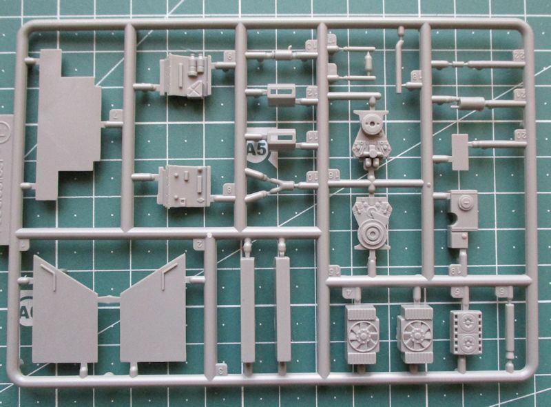 Das Laufwerk und die Ketten befinden sich auf zwei Ästen, der Motor auf einem Ast. Auf die Gummiketten der ersten Auflage wurde zugunsten von Segmenten und Einzelgliedern aus Kunststoff verzichtet. Man kann die ganze hintere Abdeckung am fertigen Modell abnehmen, um den verbauten Motor zu zeigen.