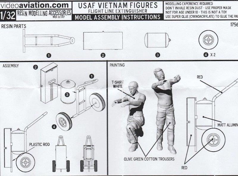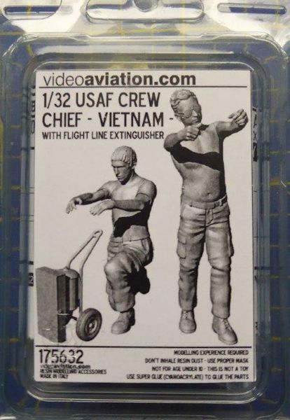 Einer neuer Figurensatz von dem Kleinserienhersteller videoaviation.com enthält in der durchsichtigen Plastikklappbox zwei Figuren aus beigefarbenen Resin. Als Zugabe gibt es noch einen Flugfeldfeuerlöscher. Die Figuren stellen Wartungspersonal der US. Air Force da. Sie sind gut modelliert und da es in Vietnam sehr heiß und schwül ist, nur mit T-Shirt bekleidet. Separate beiliegende Arme gilt es an den Korpus anzubringen. Der Resinguss ist gut gelungen, die Detaillierung der Figuren lässt auch nichts zu wünschen übrig. Der Feuerlöscher besteht aus einigen Teilen sollte sich aber gut montieren lassen. Angüsse wie üblich bei Resin entfernen. Eine kleine Anleitung mit Farbangaben liegt bei.