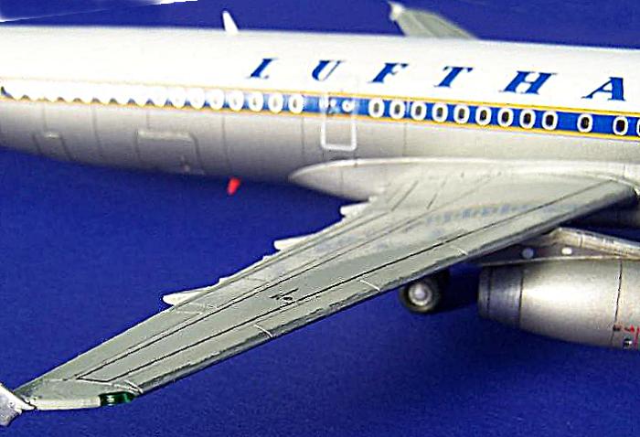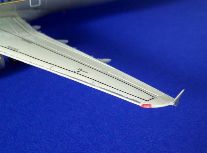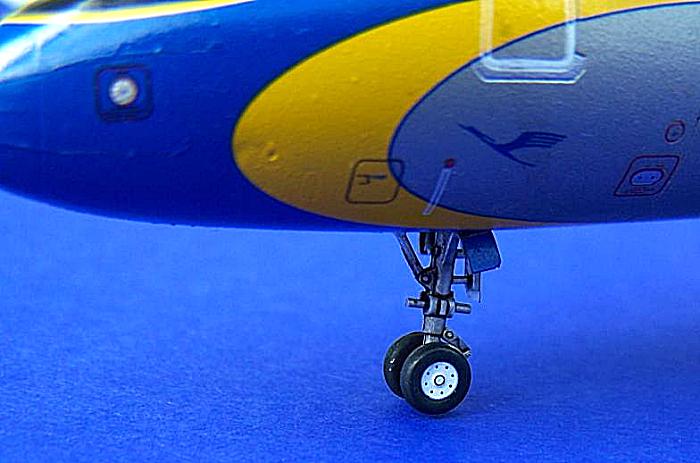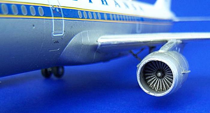 Bei der Lackierung stellt Lufthansa Revell und den Modellbauer vor ein Rätsel, denn das Hellgrau am Rumpfbauch und an den Triebwerken ist nicht einmal im Wartungscomputer der LH mit einer RAL-Nr. versehen, wie Uwes Bruder, welcher in Frankfurt beim "Kranich" tätig ist, festgestellt hat. Revell's Angabe mit Silber 90 stimmt nicht. Mein Versuch mit Xtra-Color Corrugard X 331 ist eindeutig zu dunkel. Die Farbe ist heller als das Standardgrau der LH, aber nicht mit Metallic-Effekt, sondern nur hochglänzend. Hmm, vielleicht 'ne Art Boeinggrau ... . Für die Flügel habe ich von Xtra-Color das Airbusgrey benutzt.
