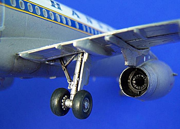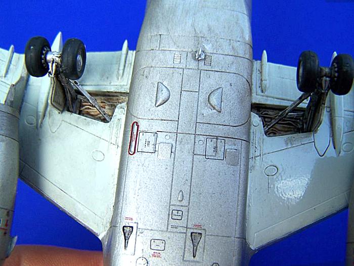 Nachdem alle Nassschiebebilder aufgebracht waren, wurde das Modell mit einer Schicht Klear(Future) versiegelt. Bei diesem Modell habe ich mal ein Washing mit Ölfarben gemacht. Dazu habe ein stark verdünntes Schwarzbraun in die Gravuren am Rumpfbauch, in die Fahrwerksschächte und die Fahrwerksbeine fließen lassen. übergelaufene Farbe habe ich mit einem Ohrbohrer wieder aufgenommen bzw. in Fahrtwindrichtung abgewischt. Sicherlich ist so ein Washing maßstäblich gesehen übertrieben, aber es gibt den Modell doch eine schöne 3-D Optik. Gerade am Triebwerksfan wird dieses deutlich.