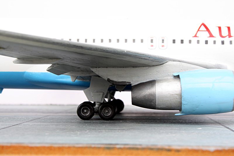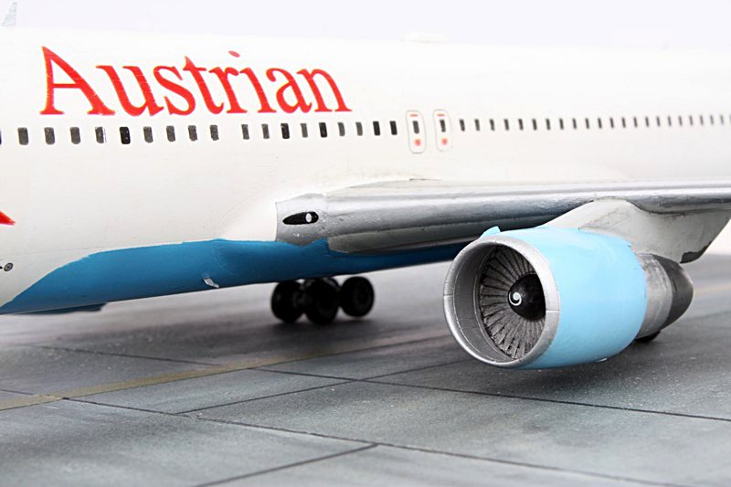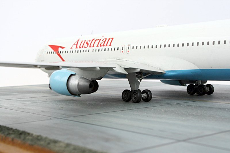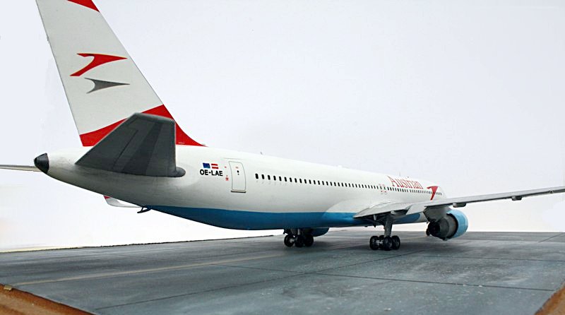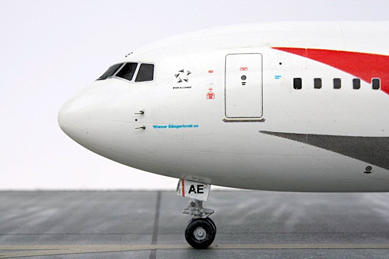 Bei den AUA typischen Schriftzügen und Symbolen habe ich auf Empfehlung von Rainer eine zweite Lage aufgebracht, damit eine schöne Deckung erreicht wird. Weiterhin verwendete ich vom Decalbogen aus der Revell 767 SAS-Gulftraveller-Auflage die schönen Stencils. Zum Versiegeln der Lackierung und der Decals bekam das Modell eine Schicht Klear (Future).