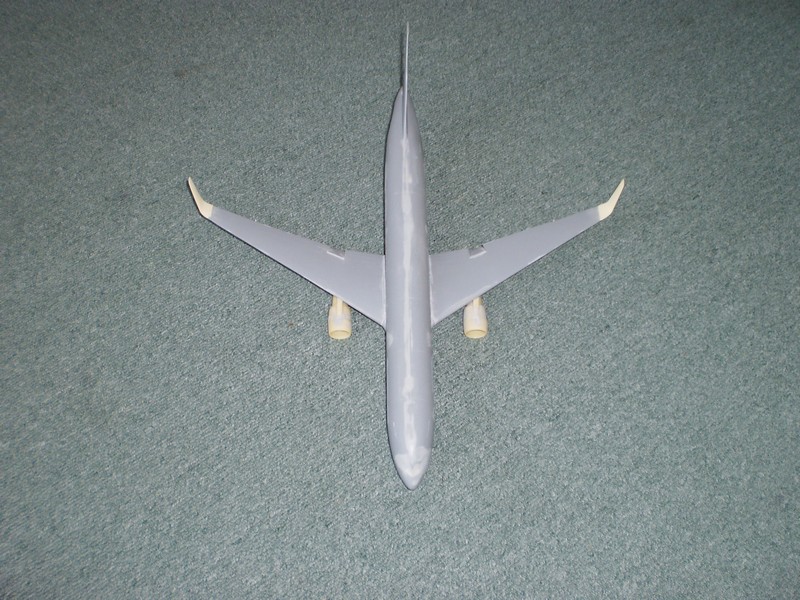 Damit war der Rohbau abgeschlossen und die Farbgebung konnte beginnen. Durch die notwendigen Spachtelarbeiten und das daraus resultierende notwendige Zusammenfügen aller Baugruppen wusste ich schon, dass eine Menge Abklebearbeiten während der Lackierung auf mich zu kommen würde. Für das Weiß verwende ich immer Revell 04, da ich damit sehr gute Erfahrungen bezüglich Haftung und Deckung gemacht habe. Mittels 4000ter und feinerer Schleifleinen von MicroMesh glätte ich dann die an sich matte Oberfläche. Für das blaue Rumpfband benutzte ich Revell 50, an den Triebwerken eine 50:50 Mischung von Selbigem und Weiß. Wichtig ist, dass man sich immer ein wenig von solchen Mischungen aufhebt, um eventuell Korrekturarbeiten mit dem gleichen Farbton durchzuführen.