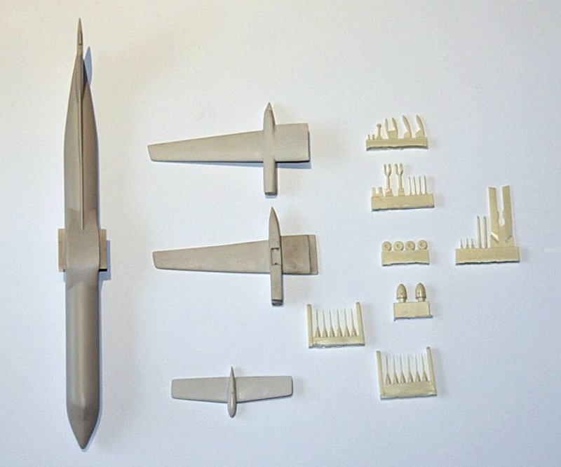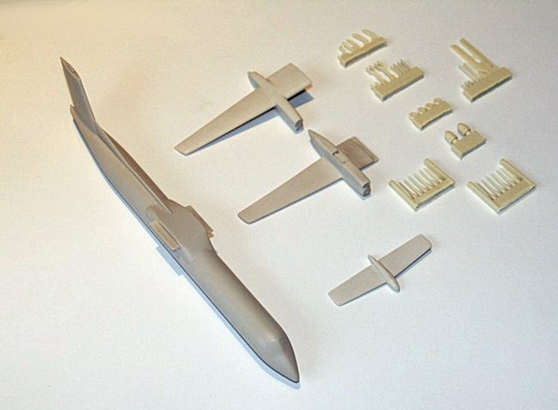 Aufgrund der Aufteilung geht der Bau schnell und problemlos über die Bühne. Interessant ist, das der Rumpf einteilig ist, das Seitenleitwerk ist auch schon mit angegossen. An der Unterseite muss ein runder Anguss entfernt werden. Dabei merkt man, das das verwendete Resin beim Rumpf deutlich härter ist. Die Tragflächen werden auf Laschen, welche aus dem Rumpf kommen, geklebt. Hierbei sollte man auf eine Ausrichtung achten. Das Gleiche gilt auch für die Höhenruder.