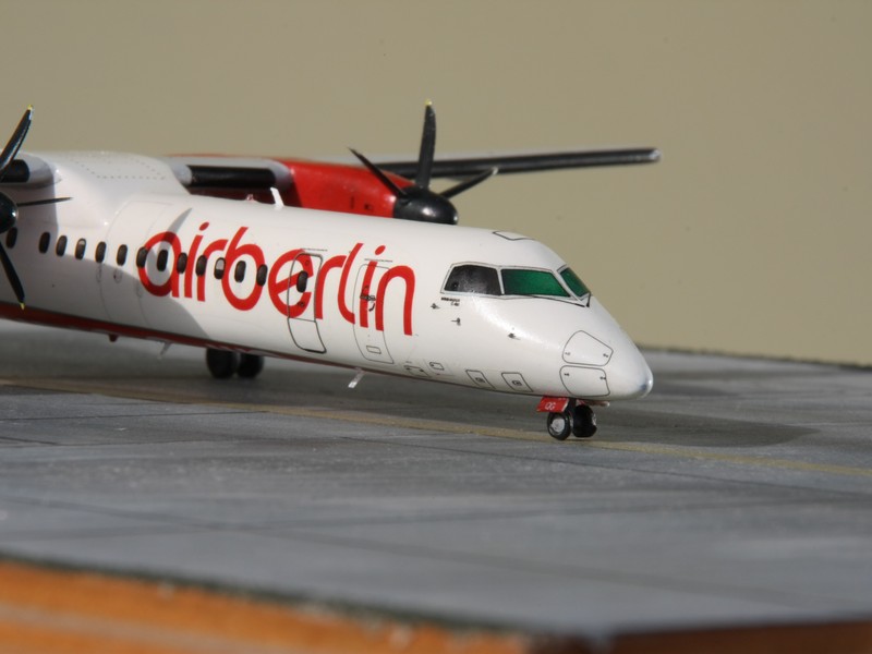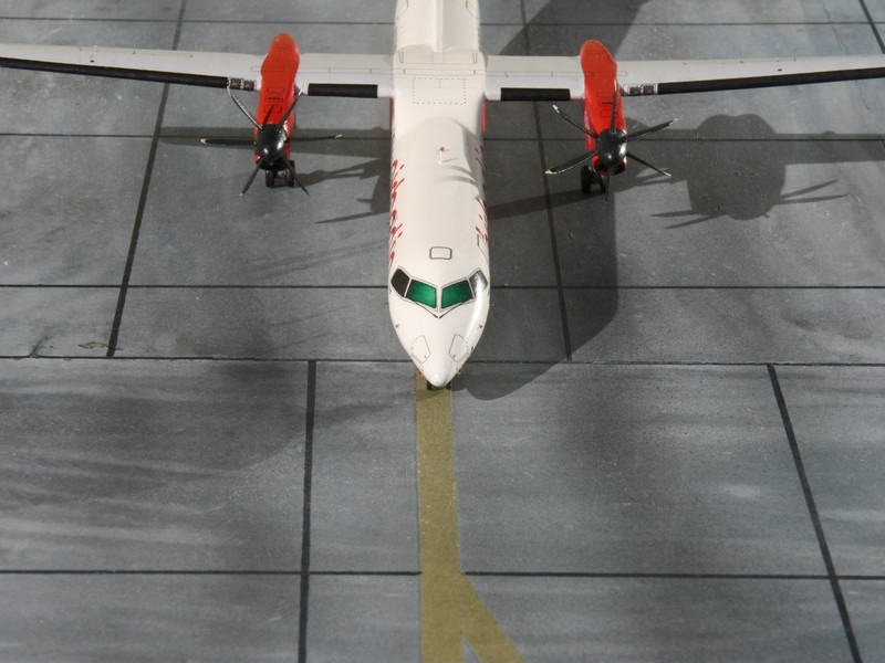 Vorbild: Die Q400 ist die momentan höchste Entwicklungstufe der Turbopropflugzeugfamilie aus Kanada. Sie wurde unter dem Namen Dash 8 bekannt und wurde Anfang der 80er Jahre von de Havilland Canada entwickelt. Gegenüber dem Urmodell Dash 8-100 wurde der Rumpf um mehr als 10 m verlängert. Damit verfügt die 400er über eine Passagierkapazität von bis zu 78 Gästen. Natürlich wurde auch das Tragwerk sowie die Stabilizierungsflächen den neuen Gegebenheiten angepasst.