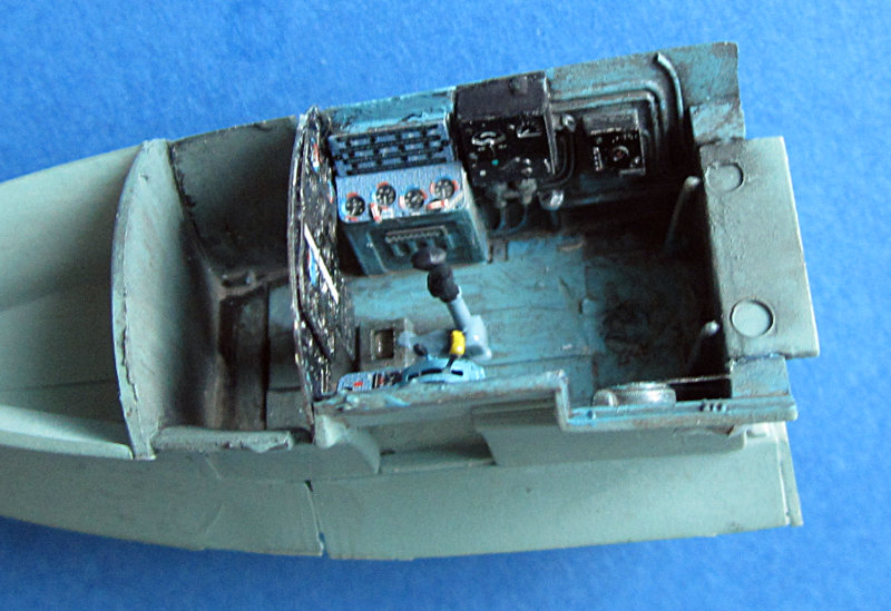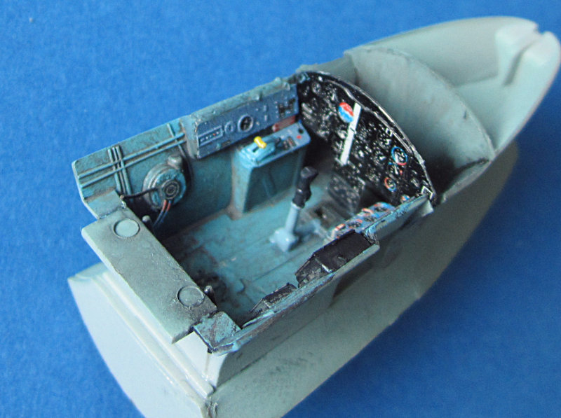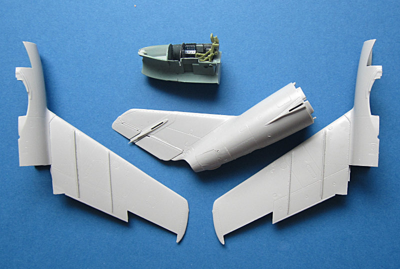 Dieser ließ sich dann nicht so schön bauen, wie angenommen und erforderte auch mehrfache Unterbrechungen, damit der Hobel nicht an der Wand landete. Im Cockpit habe ich den Eduard Zoom Satz und einen Sitz von NeOmega verbaut. Hier ist natürlich ein wenig Anpassungsarbeit vonnöten gewesen, aber nichts wirklich Dramatisches. Das Modell sollte geschlossen dargestellt werden, daher konnte ich den ganzen Triebwerkszusammenbau auf wenige Teile reduzieren. Auch die Bremsklappen sollten geschlossen sein. Nachdem nun das Heck zusammengebaut war, kam das große Spachteln, Schleifen und Nachgravieren. Eigentlich kein Problem, aber gerade letzteres macht mir keinen Spaß.