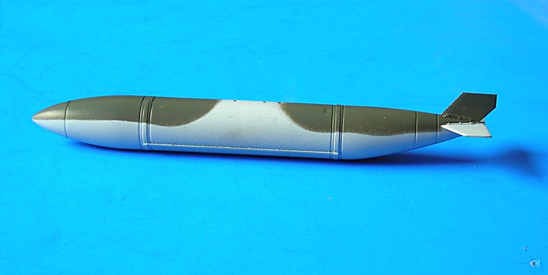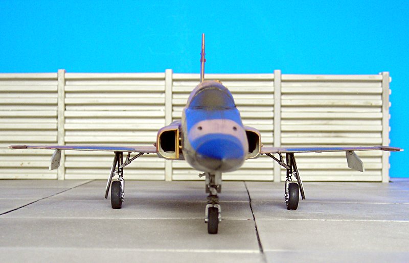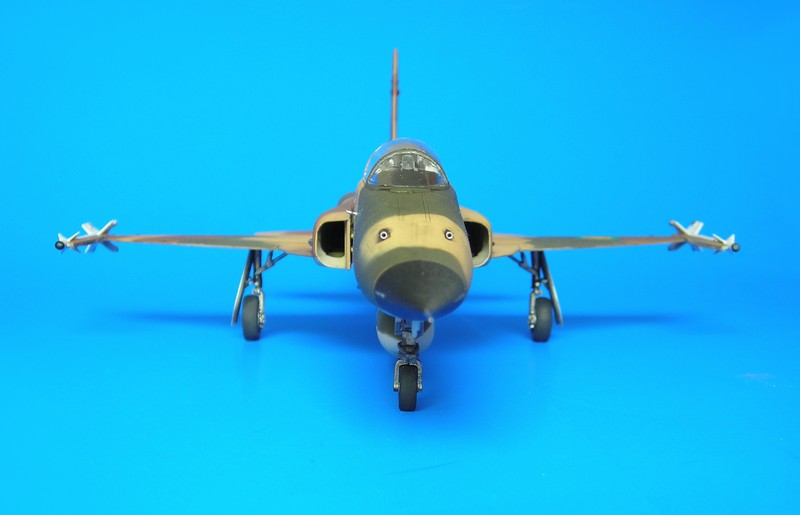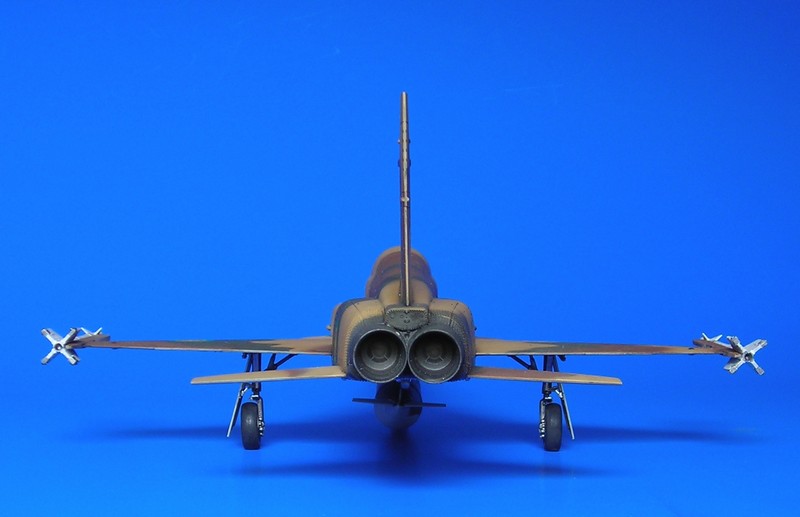 Der Tank musste auch noch bemalt werden, abgeklebt mit Tamiya Tape und UHU Tack hat auch dies gut funktioniert. Dann ging es an den Mattlack und die Verstaubung mit etwas Tamiya Buff. Von ganz Nahem sieht man eine Art „Tröpfchenbildung“, also kein gleichmäßiges einstauben, was mich etwas ärgert, aber ab einer gewissen Entfernung schiet sich dat wech. Mit Anbringen der Sidewinder B aus dem Waffenset von Hasegawa hatte ich mich dann auch entschlossen, die Flügelpylone zu entfernen. Neben der ungeklärten realen Verwendung störte mich auch der Scatchbau der Abschussschienen. Da war die Flügelaufarbeitung einfacher. Noch ein paar Kleinteile wie das Pitot angebracht und schon ist das Modell fertig.