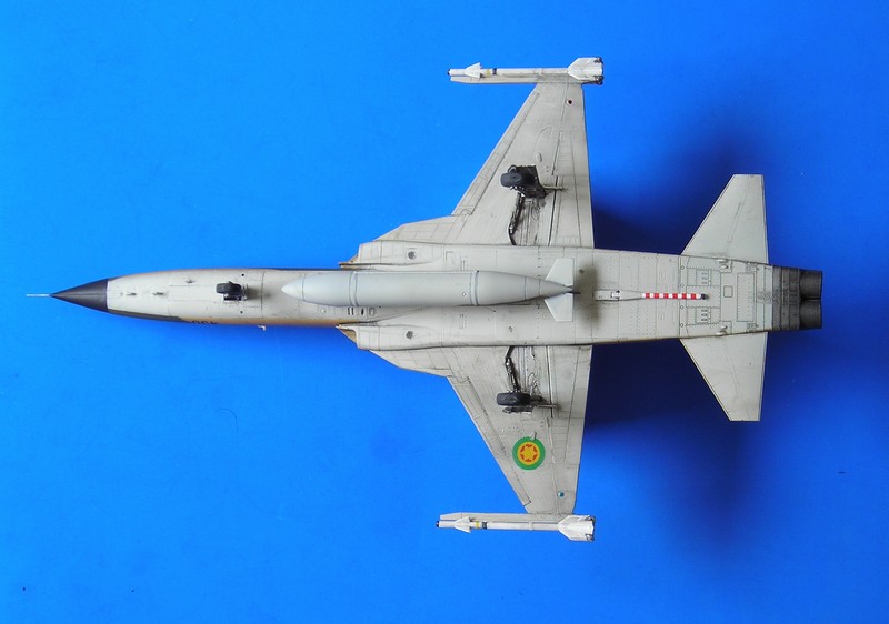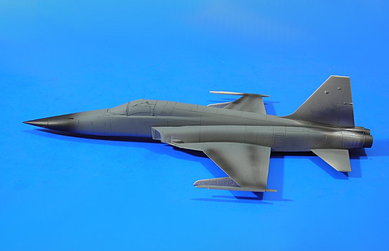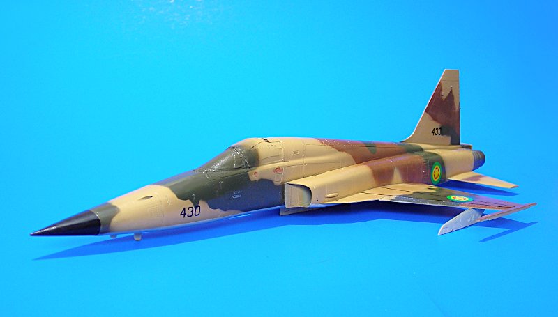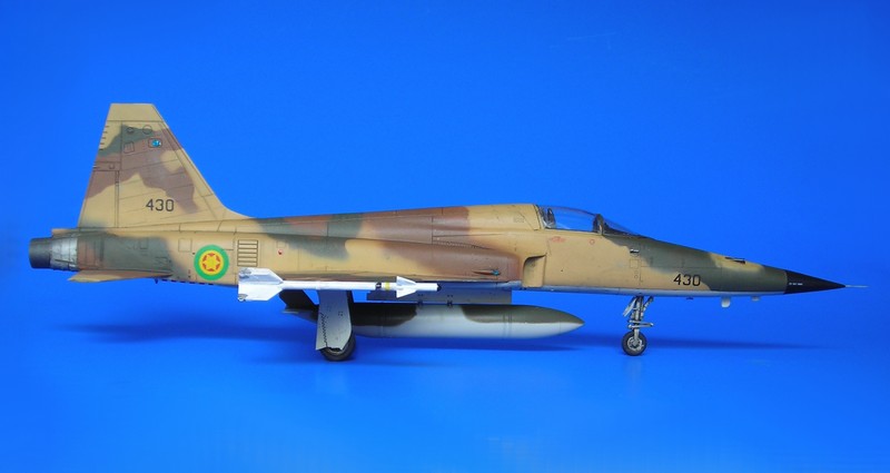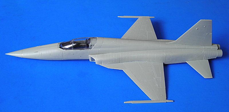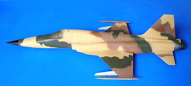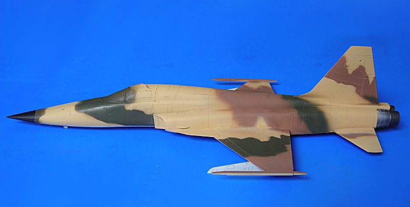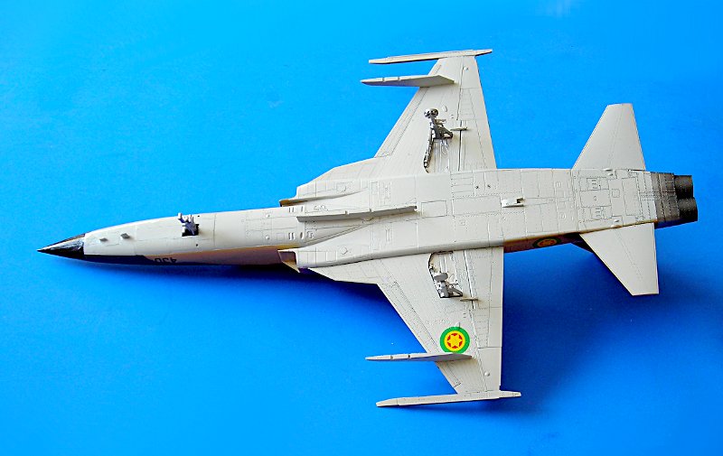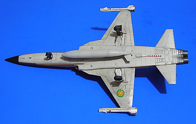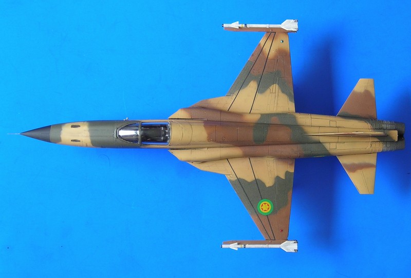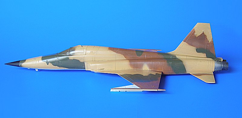 Danach ist man dann sehr schnell beim geschlossenen Modell – wie gesagt ohne Superdetaillierung. Aus dem Bericht in FR Extra hatte ich angenommen, dass die F-5E auch mit 4 Sidewinders geflogen sind, aber diesbezügliche Recherchen führten zu dem Ergebnis, dass generell eher mit zwei Raketen an den Flügelspitzen und dem Unterrumpftank geflogen wurde, um die Agilität des Flugzeugs nicht einzuschränken. Mein Modell zeigt daher zu Anfang noch die 2 Flächenpylone, die ich später entfernte - sehr spät, aber manche Entscheidungen müssen erst reifen.