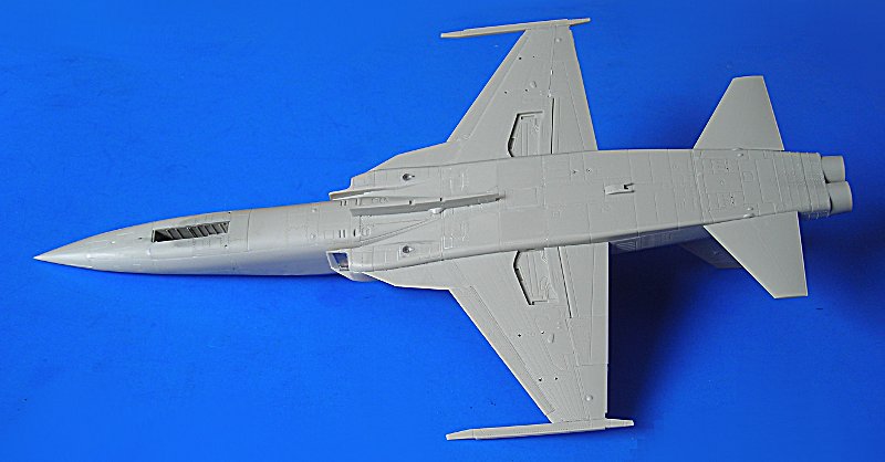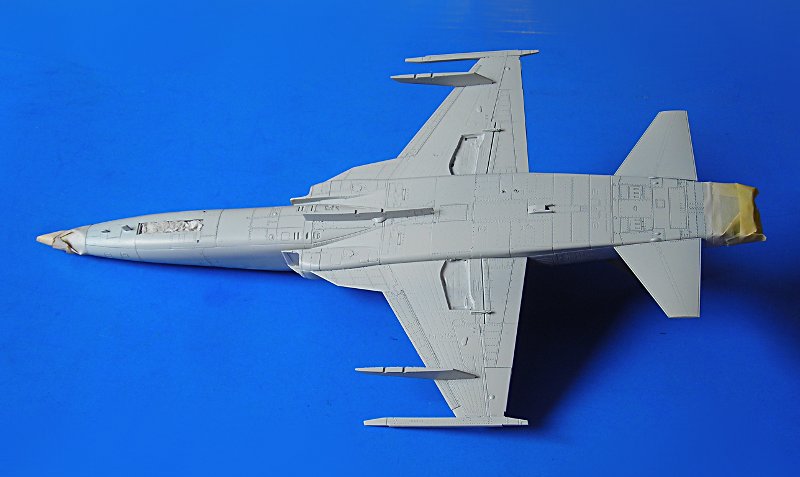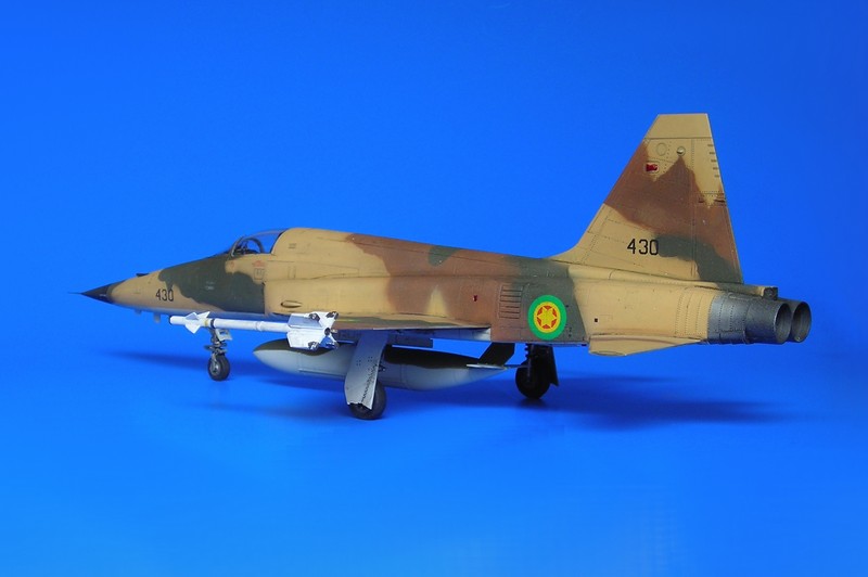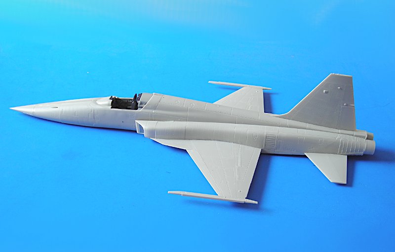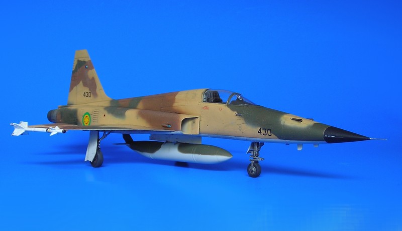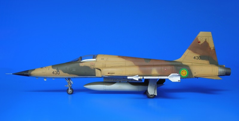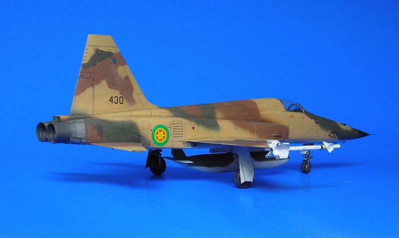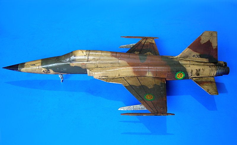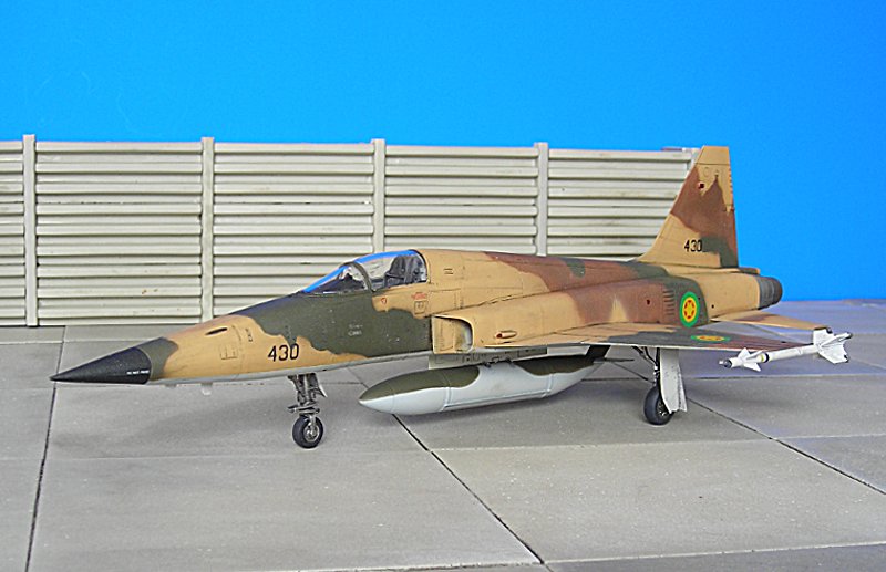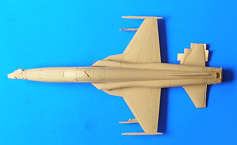 Danach ist man dann sehr schnell beim geschlossenen Modell – wie gesagt ohne Superdetaillierung. Aus dem Bericht in FR Extra hatte ich angenommen, dass die F-5E auch mit 4 Sidewinders geflogen sind, aber diesbezügliche Recherchen führten zu dem Ergebnis, dass generell eher mit zwei Raketen an den Flügelspitzen und dem Unterrumpftank geflogen wurde, um die Agilität des Flugzeugs nicht einzuschränken. Mein Modell zeigt daher zu Anfang noch die 2 Flächenpylone, die ich später entfernte - sehr spät, aber manche Entscheidungen müssen erst reifen.