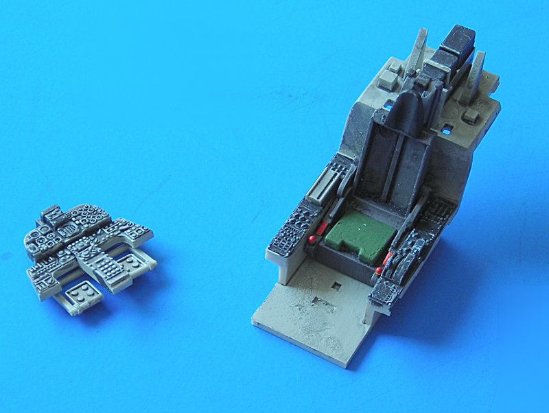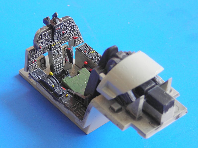 Doch von Anfang an: Los geht es unweigerlich mit dem Cockpit. Da ich das Flugzeug möglichst geschlossen darstellen wollte, um die eleganten Linien nicht zu brechen, investierte ich hier nicht allzu viel Aufwand, zumal auch noch kein Zubehör erhältlich war. Alles nach Bauanleitung und ohne Schnickschnack. Letztendlich ist der Eindruck in Ordnung und nur ein sehr naher Blick würde hier den „Mangel“ offenbaren (insbesondere die fehlenden Gurte).