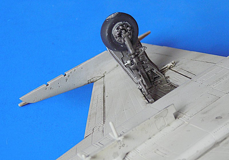 Nun kam noch ein sehr fummeliger Bauabschnitt, den ich aber erstaunlicherweise mit etwas Vorraussicht bewältigt habe. Die kleinen Ärmchen zum Halten der Hauptfahrwerksklappen sind nämlich nur sehr schwer anzubringen. Ich habe den aus zwei Streben bestehende Teil an die Klappe geklebt (bestmöglich ausgerichtet) und durchtrocknen lassen – sehr gründlich. Dann habe ich diese Baugruppe an das Fahrwerksbein geklebt und den Arm auf der anderen Seite ergänzt. Mit etwas nachjustieren und Geduld ging das ganz gut.
